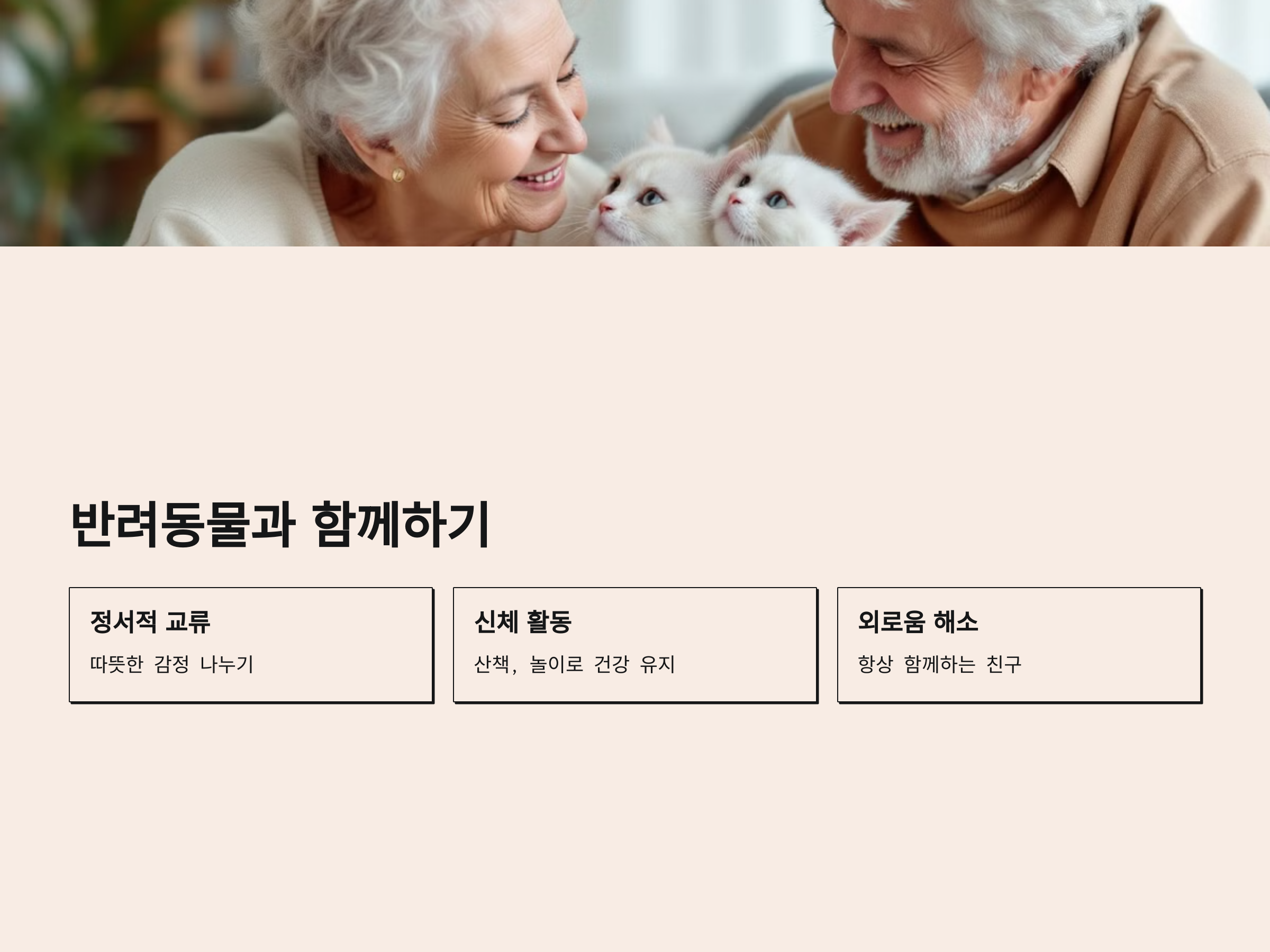 반려동물은 주인의 기분을 알아채고, 정서적으로 매우 큰 지원을 해줍니다. 또한, 집에서 보내는 시간이 많아지는 노후에 반려동물과의 교감은 큰 즐거움이 될 수 있습니다.