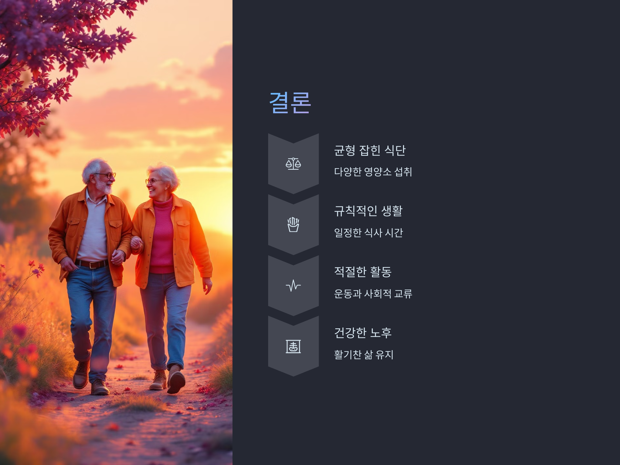 노년기의 건강한 생활을 위해서는 균형 잡힌 식단과 규칙적인 생활 습관이 필수적입니다. 위에서 제시한 식단과 생활 습관을 참고하여 활기차고 건강한 노후를 준비하시기 바랍니다.