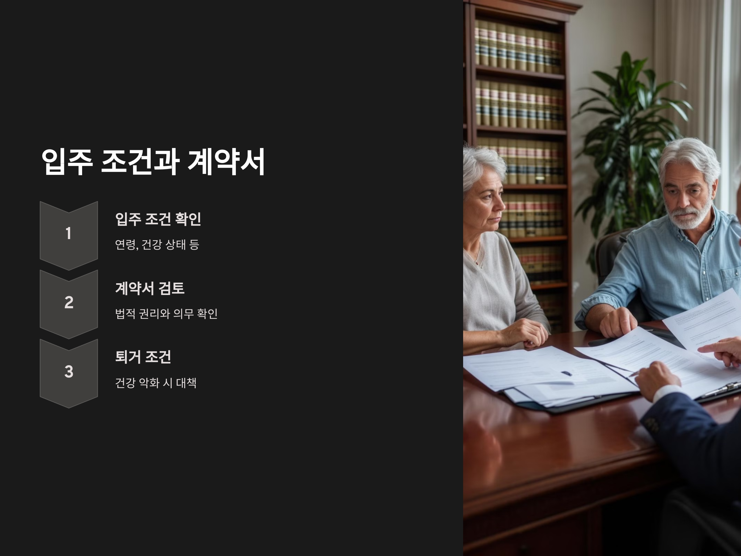 실버타운에 입주하기 전, 입주 조건과 계약서를 철저히 검토해야 합니다. 특히, 계약서에는 입주 후 발생할 수 있는 상황에 대한 규정이 명확히 들어 있어야 합니다. 예를 들어, 입주 후 건강 상태가 악화되어 보호형 실버타운으로 옮겨야 할 경우의 절차나, 퇴거 시의 조건 등을 반드시 확인해야 합니다. 이러한 법적, 계약적 문제는 후에 큰 문제가 될 수 있으므로 주의가 필요합니다.