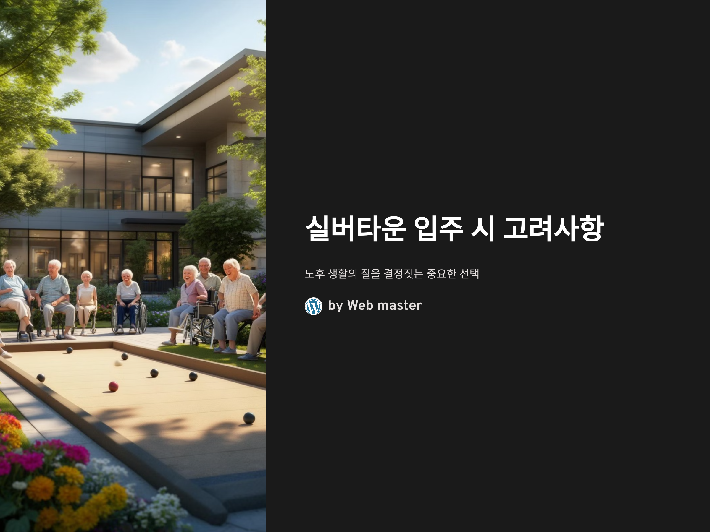 노후에 실버타운에 입주하려는 분들이 점점 늘어나고 있습니다. 은퇴 후 여유롭고 편안한 삶을 위한 최적의 선택처럼 보이지만, 실제로 실버타운을 선택할 때 고려해야 할 점들은 생각보다 많습니다. 실버타운이 단순한 주거지가 아니라, 건강과 삶의 질에 직접 영향을 미치는 중요한 결정이기 때문에 각 요소를 세심하게 점검해야 합니다. 이번 글에서는 실버타운 입주를 고려할 때 꼭 체크해야 할 6가지 중요한 포인트를 소개합니다.