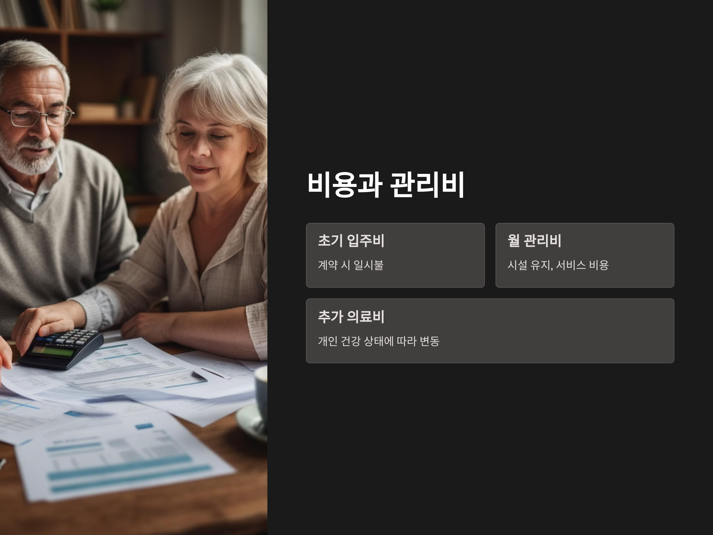 실버타운 입주 시 가장 중요한 점 중 하나는 비용 문제입니다. 실버타운은 초기 입주비 외에도 매달 관리비와 추가적인 의료비 등이 발생할 수 있습니다. 이러한 비용을 사전에 충분히 파악하고, 예산을 잘 계획해야 합니다. 또한, 계약서에 명시된 비용 항목이 정확한지, 추가 요금이 발생할 가능성은 없는지 꼼꼼히 확인하는 것이 필요합니다. 비용이 중요한 만큼, 장기적으로 경제적인 부담을 줄일 수 있는 실버타운을 선택하는 것이 중요합니다.