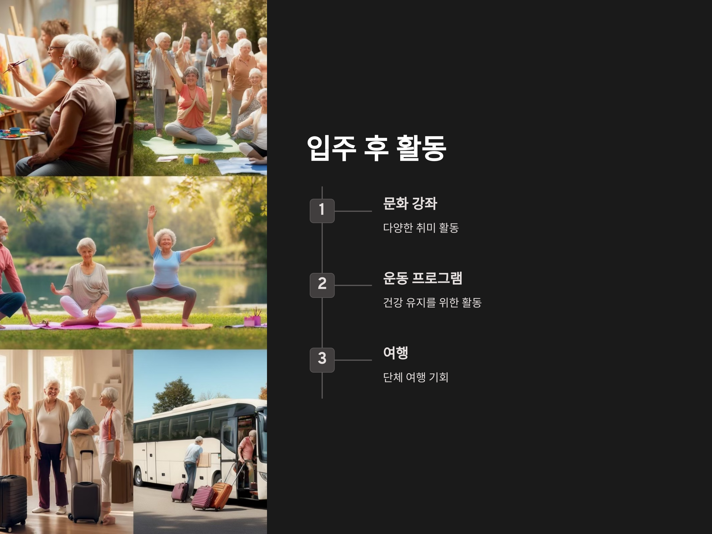 노후 생활에서 중요한 부분은 사회적 교류입니다. 실버타운에서는 다양한 활동을 통해 입주민들 간의 상호작용을 유도하는데, 그 활동의 종류와 수준을 확인하는 것이 필요합니다. 문화 강좌, 운동 프로그램, 여행 등 다양한 활동이 제공되는지 확인하고, 자신의 취향에 맞는 활동을 즐길 수 있는지 점검해 보세요. 활동적인 생활을 할 수 있도록 다양한 프로그램이 마련된 곳이 더 나은 선택이 될 수 있습니다.