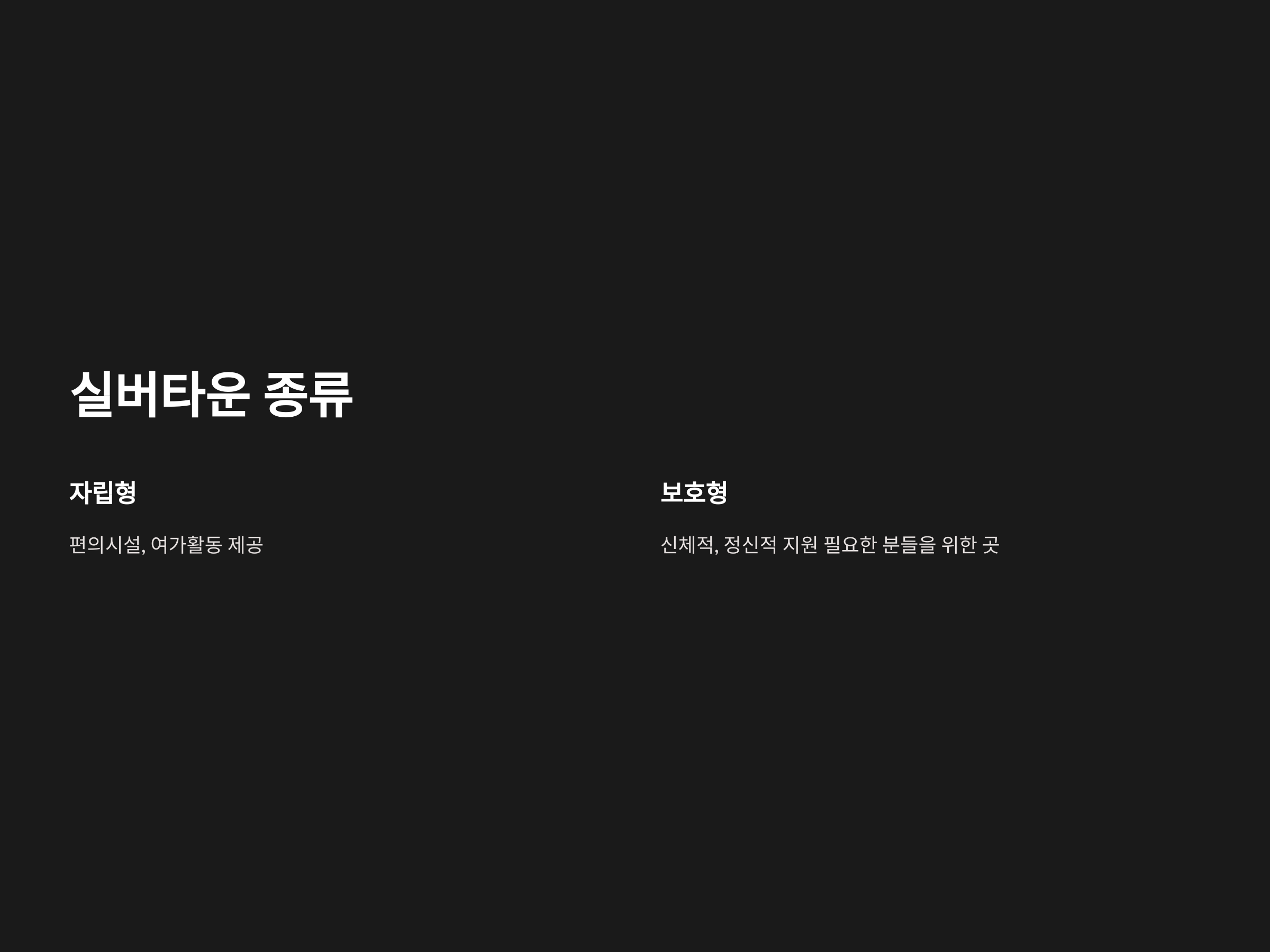 실버타운에는 다양한 유형이 존재합니다. 기본적으로 자립형 실버타운과 보호형 실버타운으로 나뉩니다. 자립형 실버타운은 생활에 불편함이 없는 분들을 위한 곳으로, 각종 편의시설과 여가활동을 제공하는 곳입니다. 반면, 보호형 실버타운은 고령으로 인해 신체적, 정신적 지원이 필요한 분들을 위해 제공되는 곳입니다.