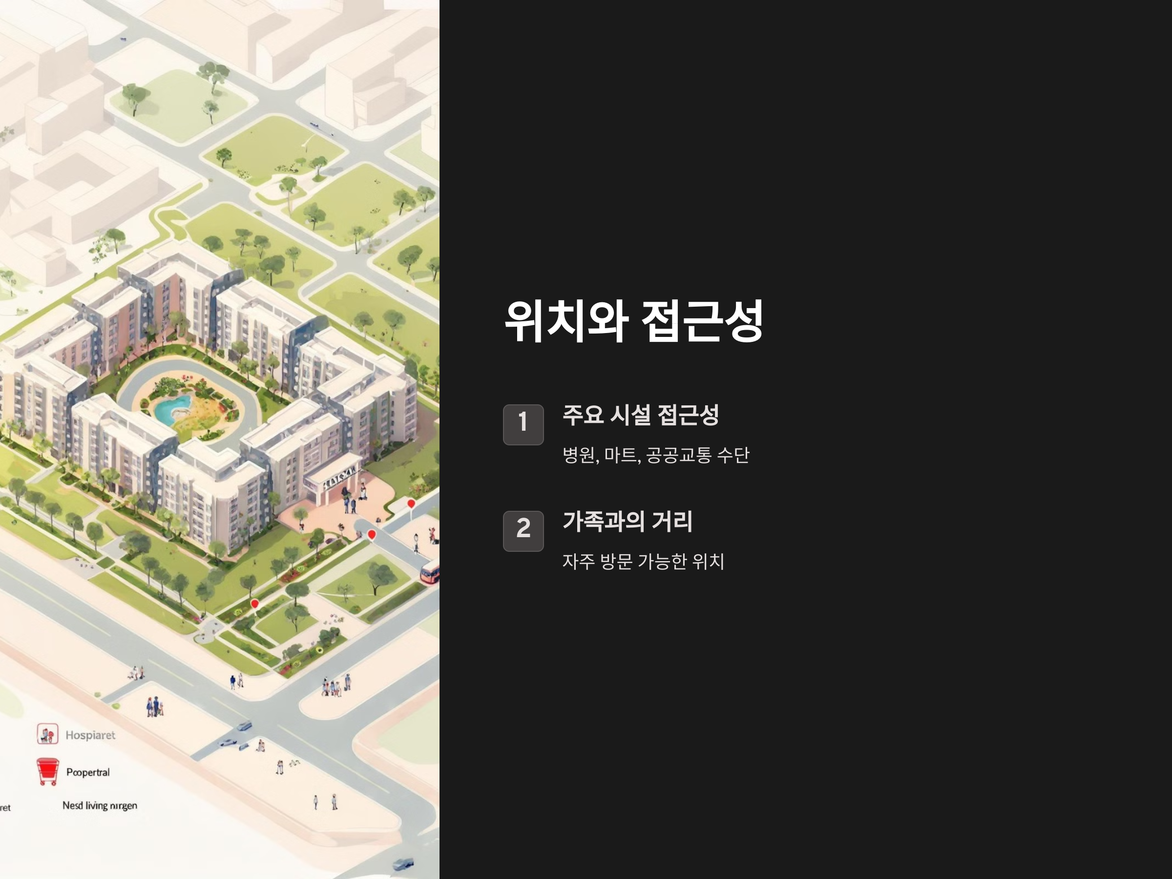 실버타운의 위치는 매우 중요합니다. 실버타운을 선택할 때, 일상생활에서의 편리함을 고려해야 합니다. 병원, 마트, 공공교통 수단 등의 주요 시설과의 접근성이 좋은 위치를 선택하는 것이 좋습니다. 또한, 자주 방문할 수 있는 가족이나 친척과의 거리가 너무 멀지 않도록 고려하는 것이 중요합니다. 노후에 자주 외출하거나 가족과의 교류가 중요한 분이라면, 교통이 편리한 위치가 큰 장점이 될 수 있습니다.