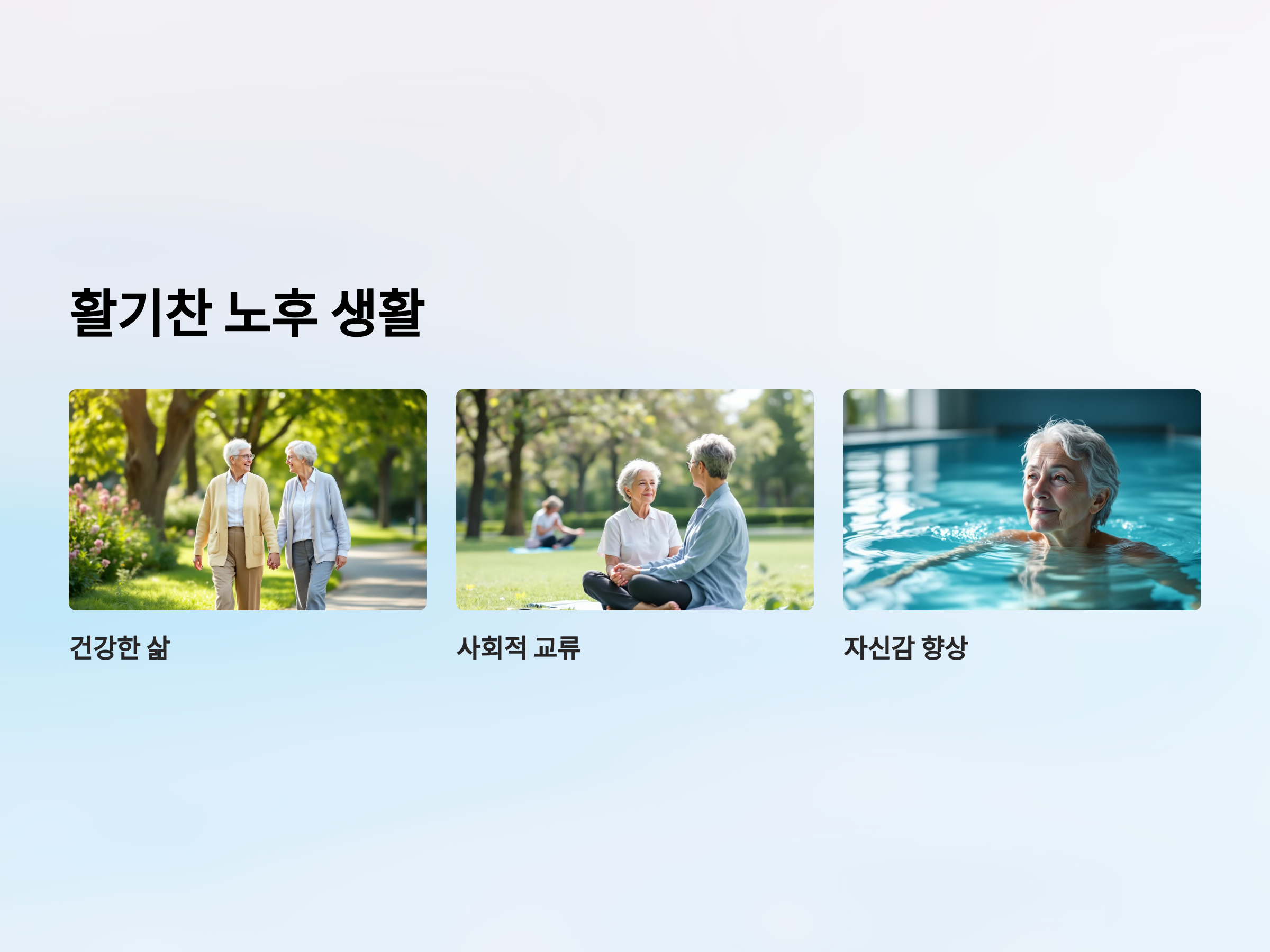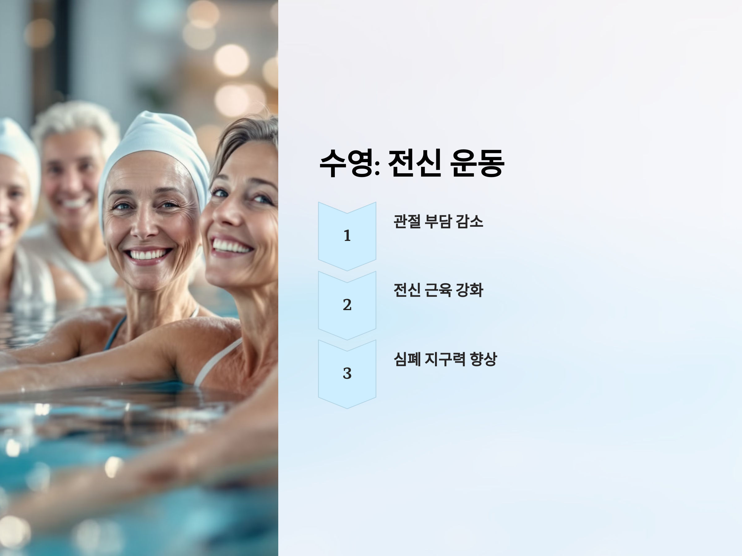 수영은 전신을 고루 사용하는 운동으로, 무릎과 허리에 부담을 주지 않으면서도 효과적인 운동입니다. 물의 부력 덕분에 관절에 무리가 가지 않으며, 동시에 심폐 기능을 강화하고 체력을 향상시킬 수 있습니다. 특히 노인들에게 수영은 관절염이나 허리 통증을 가진 사람들이 운동할 수 있는 좋은 방법이 됩니다.