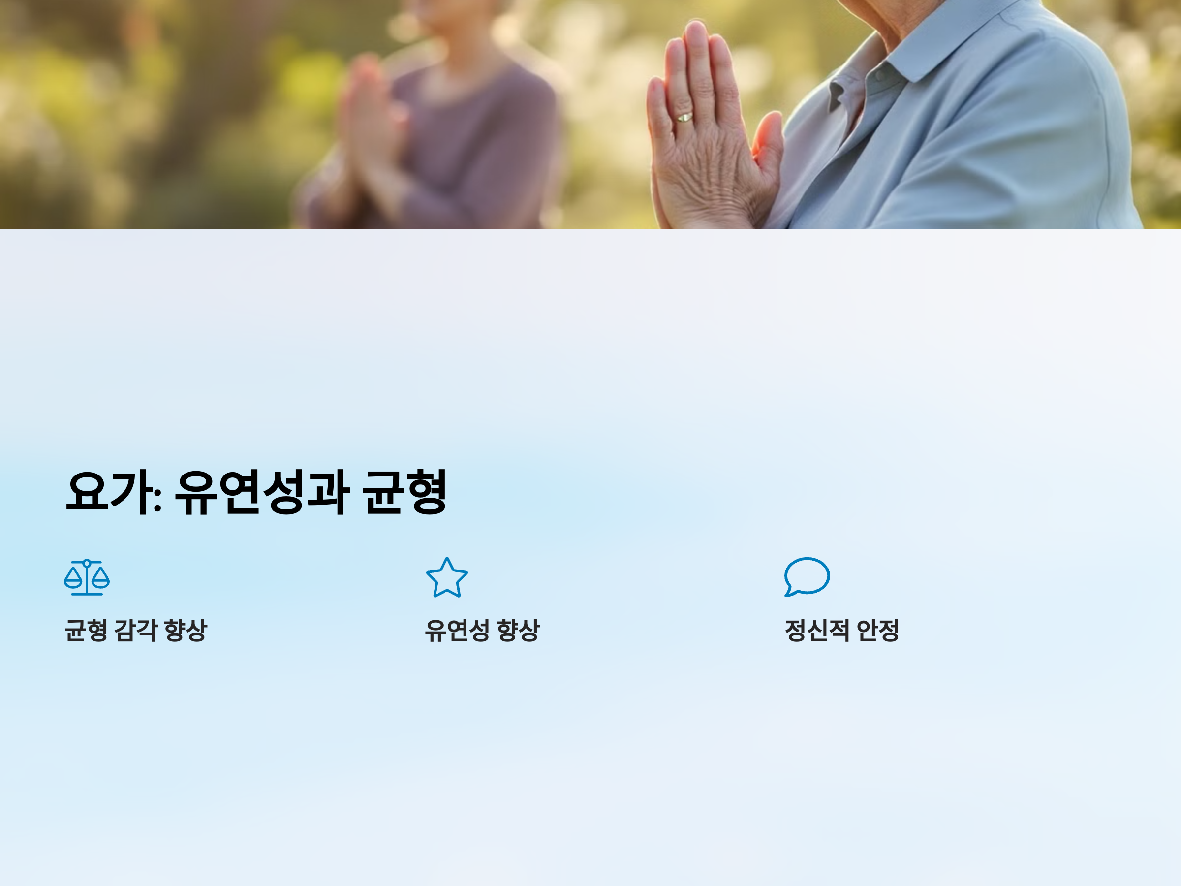 요가는 신체의 유연성을 키우고, 균형 감각을 유지하는 데 매우 유익한 운동입니다. 특히 노인의 경우, 균형을 잘 유지하지 못하면 낙상의 위험이 증가할 수 있습니다. 요가는 이러한 균형 감각을 높여주고, 유연성 또한 향상시킬 수 있기 때문에 노후 건강을 지키는 데 큰 도움이 됩니다.