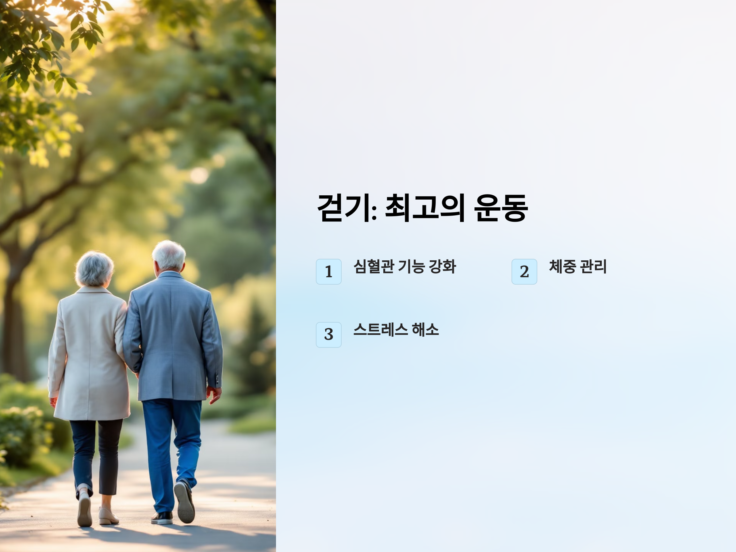 걷기는 나이에 관계없이 누구나 할 수 있는 가장 간단하고 효과적인 운동입니다. 하루에 30분에서 1시간 정도 꾸준히 걷는 것만으로도 심혈관 건강을 개선하고, 체중을 관리하며, 정신적인 안정감을 얻을 수 있습니다. 걷기는 특별한 장비나 공간이 필요하지 않으며, 무리가 가지 않는 범위 내에서 언제 어디서나 실천할 수 있는 장점이 있습니다.