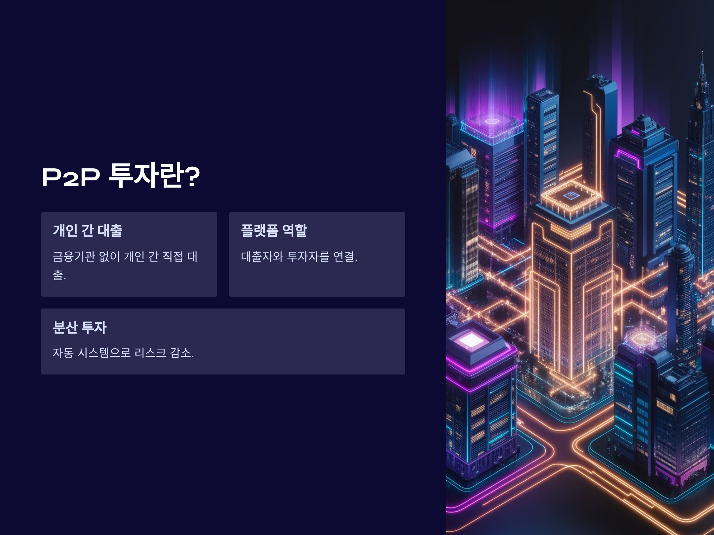 P2P 투자 플랫폼은 대출자와 투자자를 직접 연결해주는 역할을 하며, 대부분의 플랫폼은 자동화된 시스템을 통해 투자자의 자금을 여러 대출자에게 분산시켜 리스크를 낮추는 구조를 가지고 있습니다. 노후 준비를 위한 투자로 P2P가 유리한 점은, 상대적으로 높은 수익을 제공하면서도 다양한 대출자에게 분산 투자할 수 있다는 점입니다.