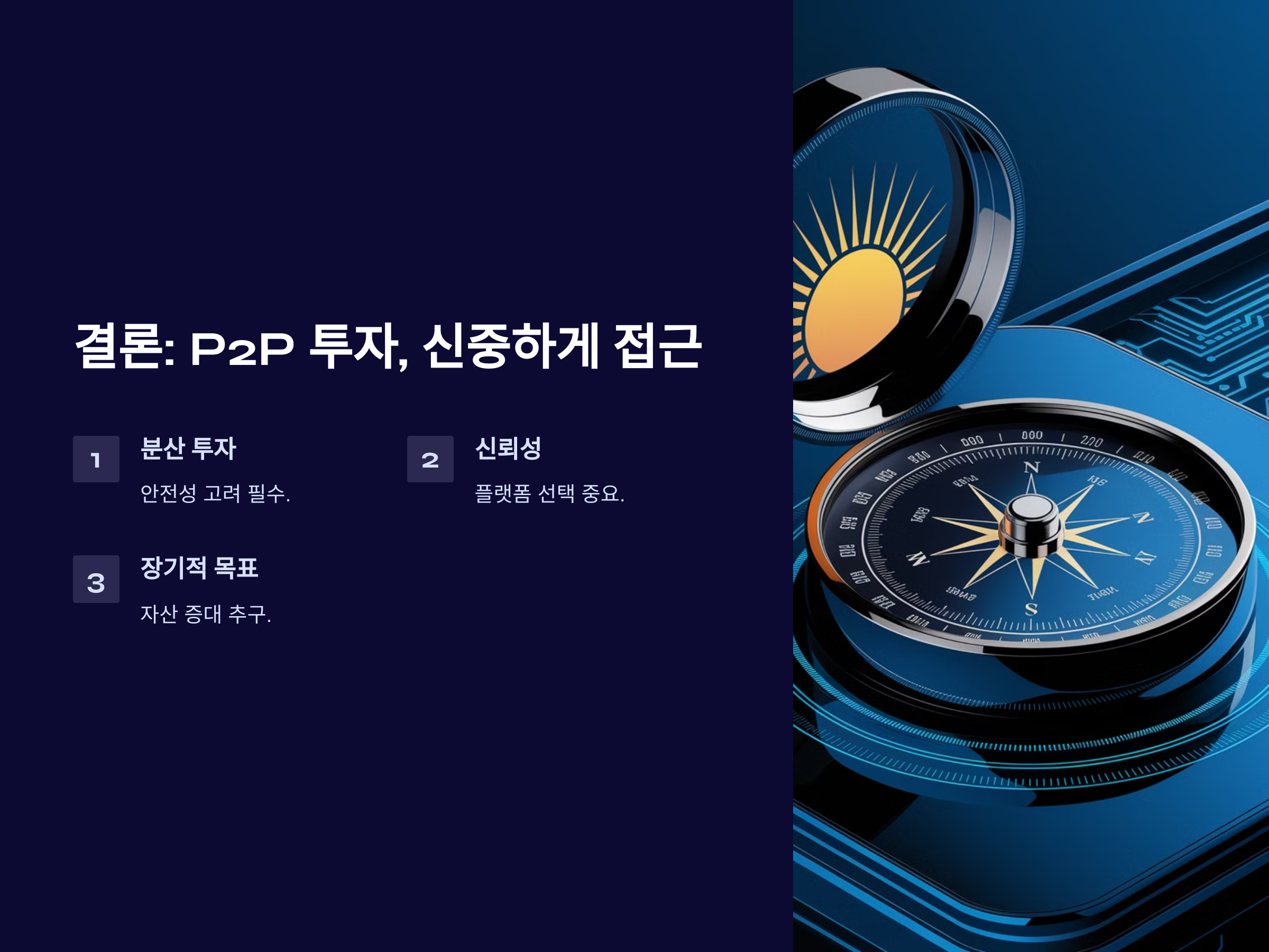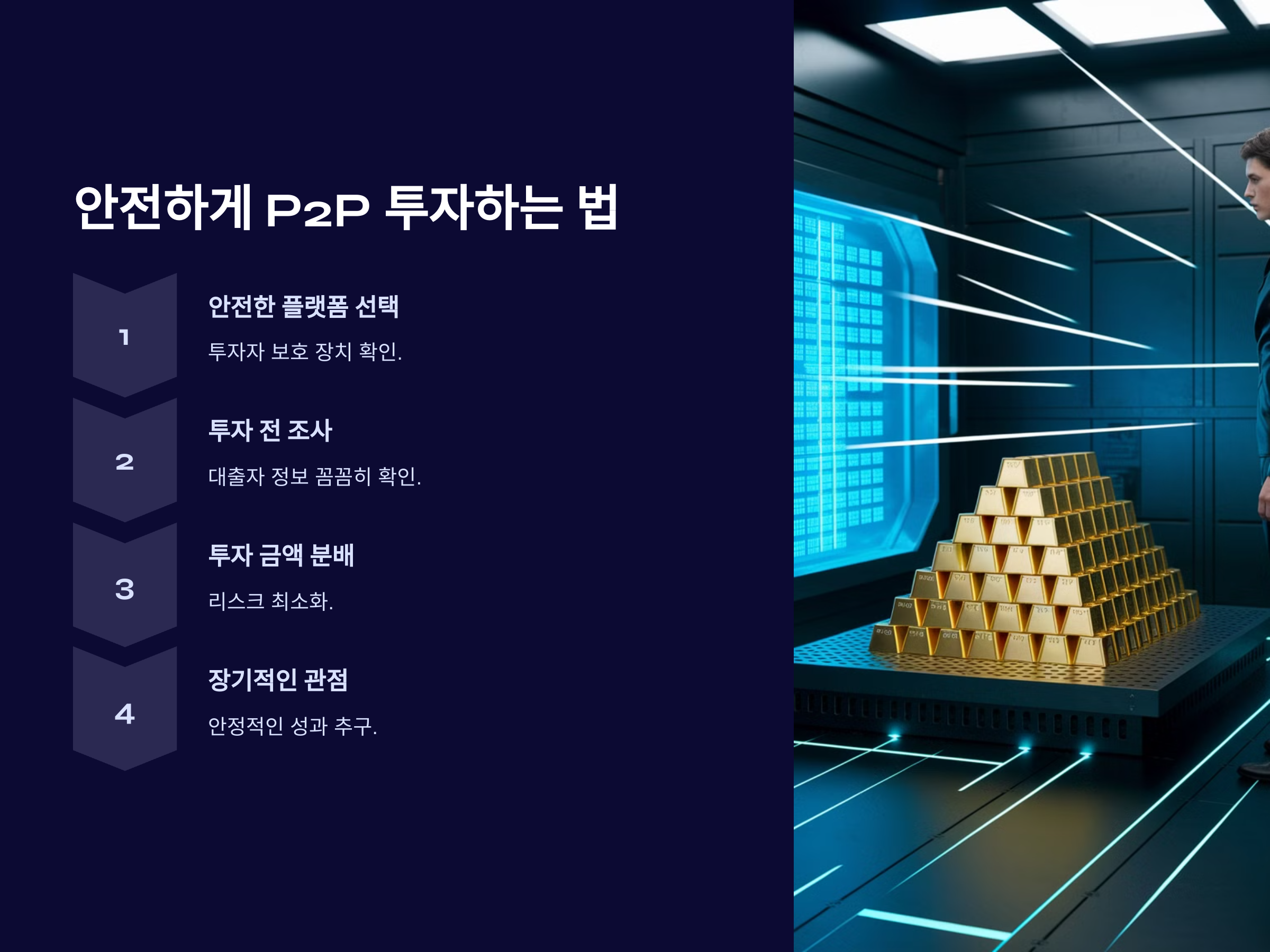 P2P 투자에는 반드시 리스크가 따르므로, 안전한 투자를 위해서는 몇 가지 기본적인 원칙을 지켜야 합니다.