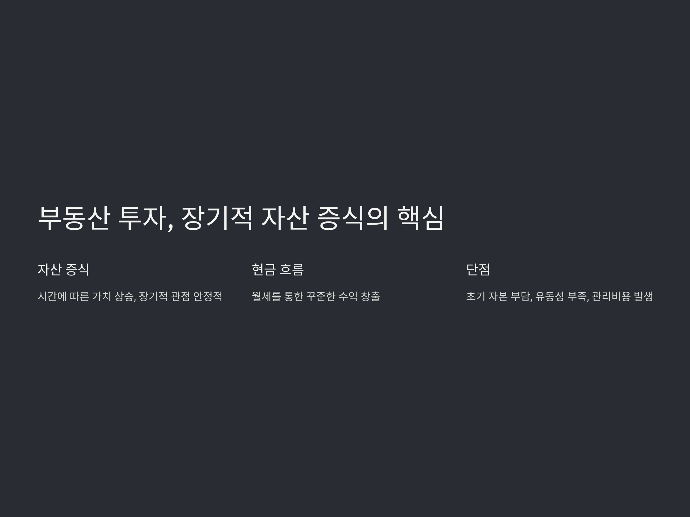 부동산은 장기적인 관점에서 안정적인 수익을 제공하는 자산으로, 특히 대도시 지역의 부동산은 시간이 지날수록 가치가 상승하는 경향이 있습니다. 최근 몇 년 간 저금리 정책으로 인해 부동산 시장이 과열되었지만, 여전히 많은 투자자들이 부동산을 주요한 자산으로 보고 있습니다.