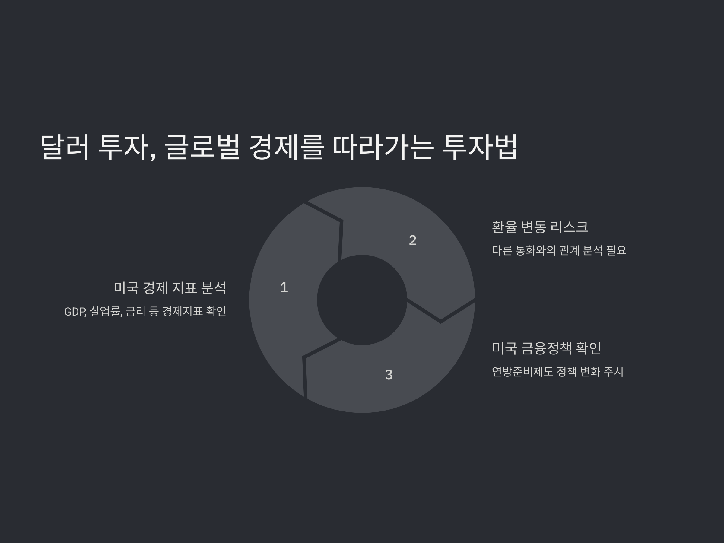 미국은 세계 경제의 중심으로, 달러는 국제적인 거래에서 중요한 역할을 합니다. 미국 경제가 성장하면 달러 가치는 상승하고, 반대로 미국의 경제 성장률이 둔화되면 달러 가치는 하락할 수 있습니다. 따라서 달러 투자자는 미국 경제와 금융 정책에 민감하게 반응해야 합니다.