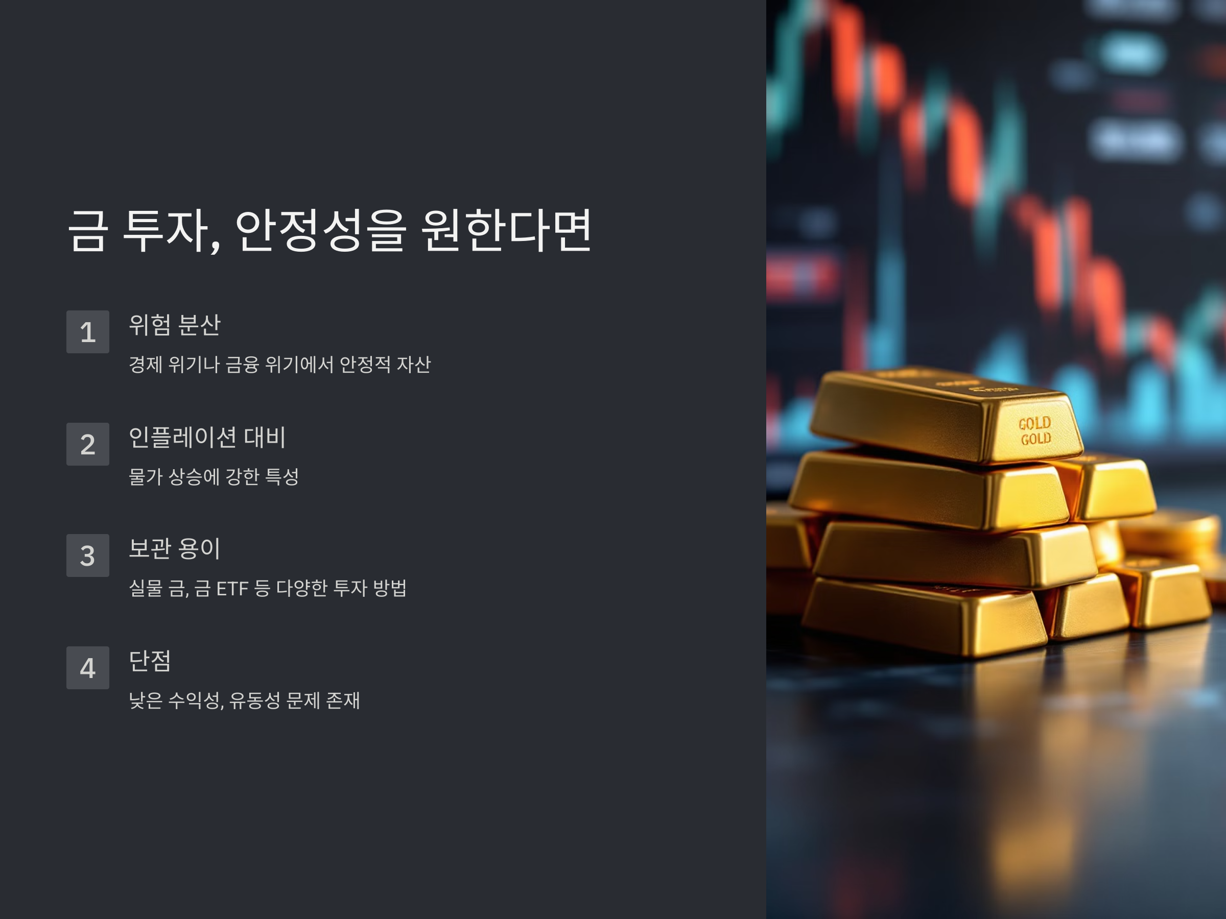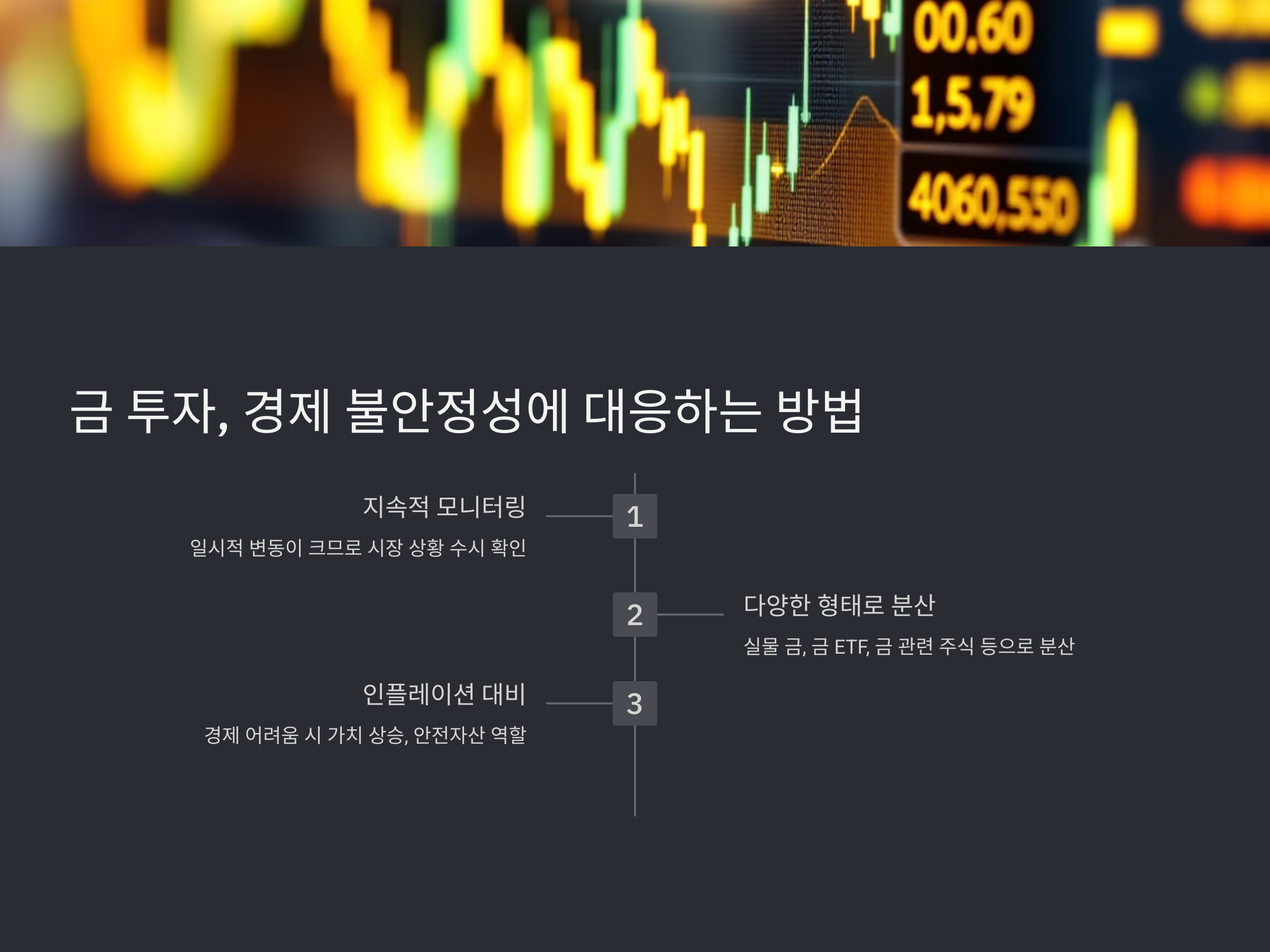 - 다양한 형태로 분산: 금을 실물로 보유하기보다는 금 ETF나 금 관련 주식 등 다양한 형태로 분산 투자하는 것이 좋습니다.