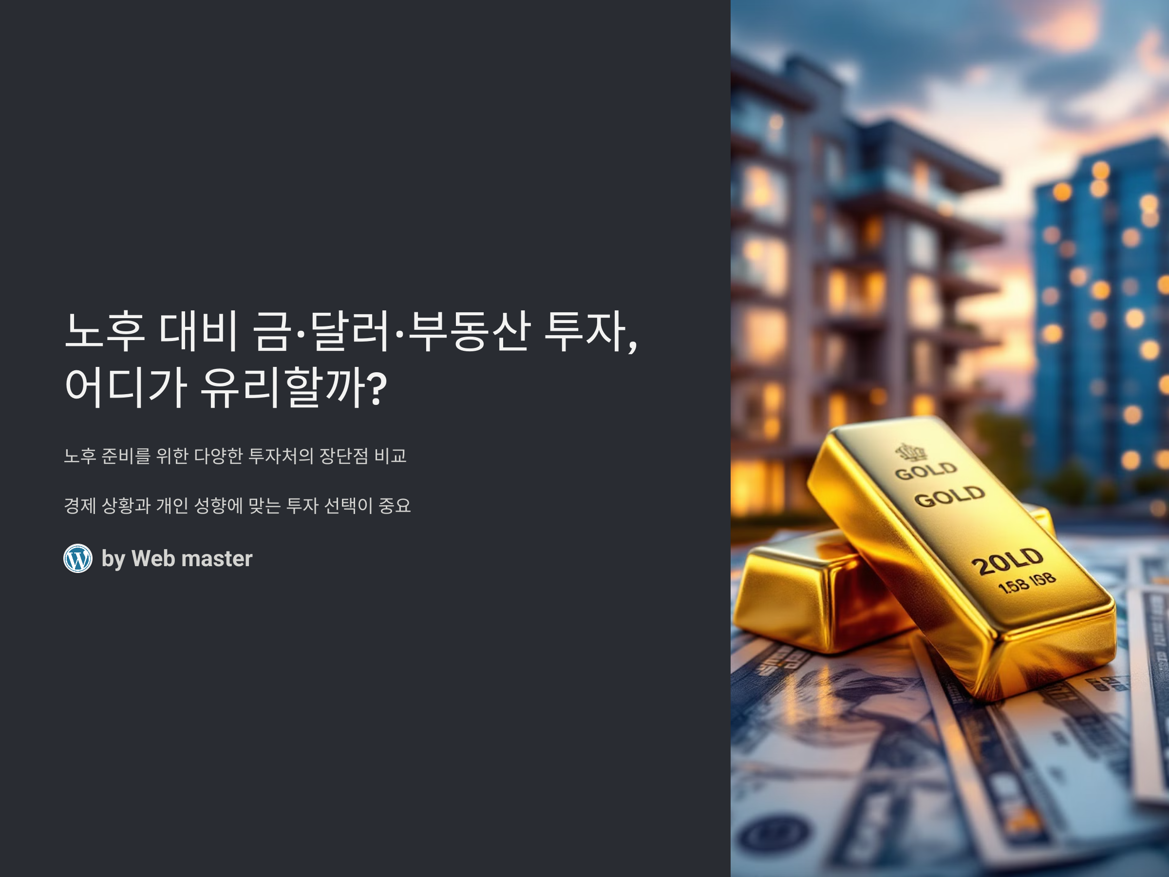 요즘 많은 사람들이 노후 준비를 위해 다양한 투자처를 찾고 있습니다. 그 중에서도 금, 달러, 부동산은 각기 다른 장점과 특징을 가지고 있어 어떤 것이 유리할지 고민하는 사람들이 많습니다. 각 투자처의 특성을 이해하고, 현재의 경제 상황과 개인의 투자 성향을 고려해 선택하는 것이 중요합니다. 본 포스트에서는 금, 달러, 부동산 투자의 장단점과 현재 경제 상황에 맞는 선택 방법을 비교하여 안내드리겠습니다.