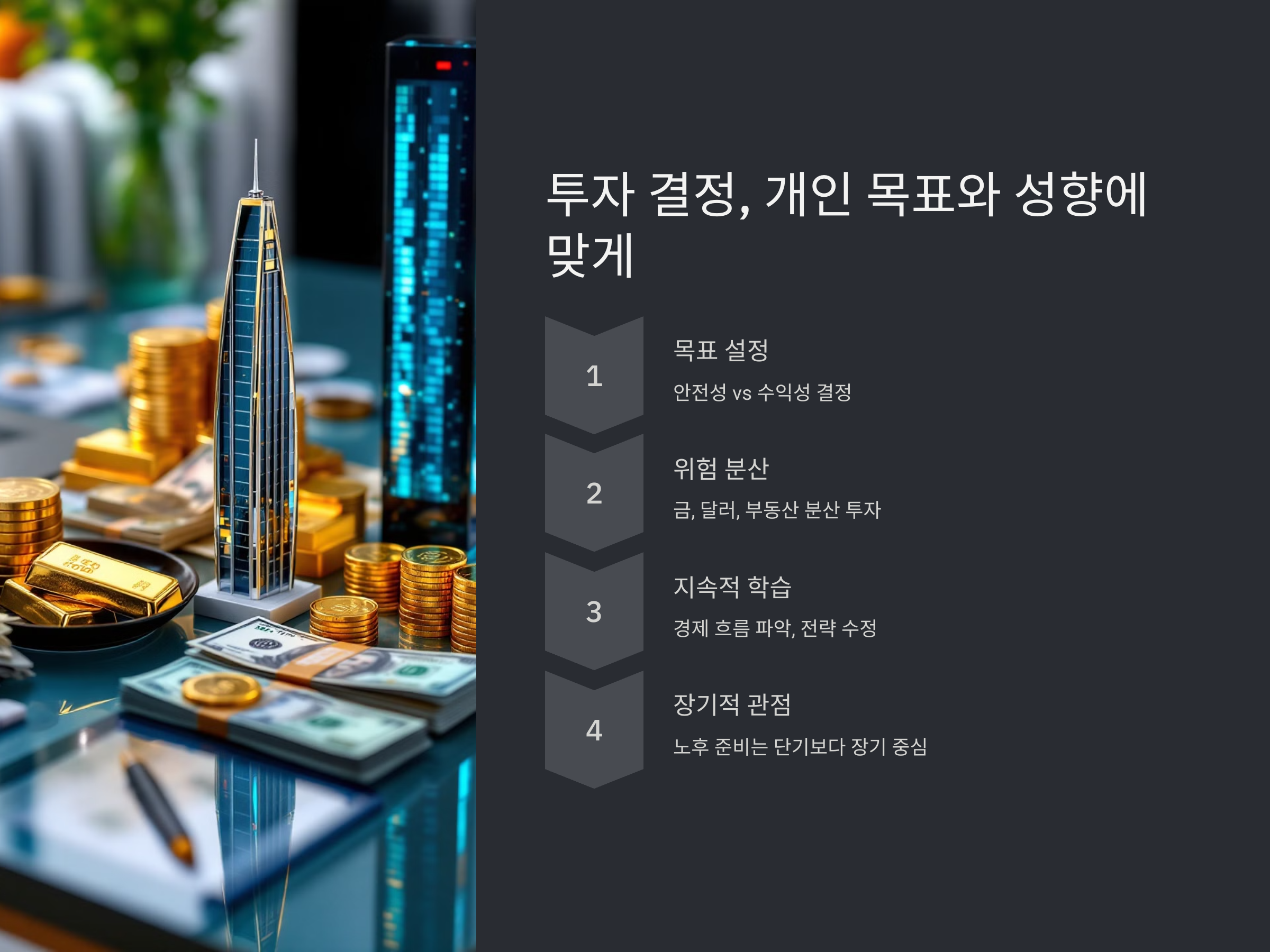 금, 달러, 부동산 투자 각각의 특성을 잘 이해하고, 자신의 투자 목적에 맞는 자산을 선택하는 것이 중요합니다. 위험을 분산하고 장기적인 관점에서 투자하는 것이 노후 준비에 도움이 될 수 있습니다.