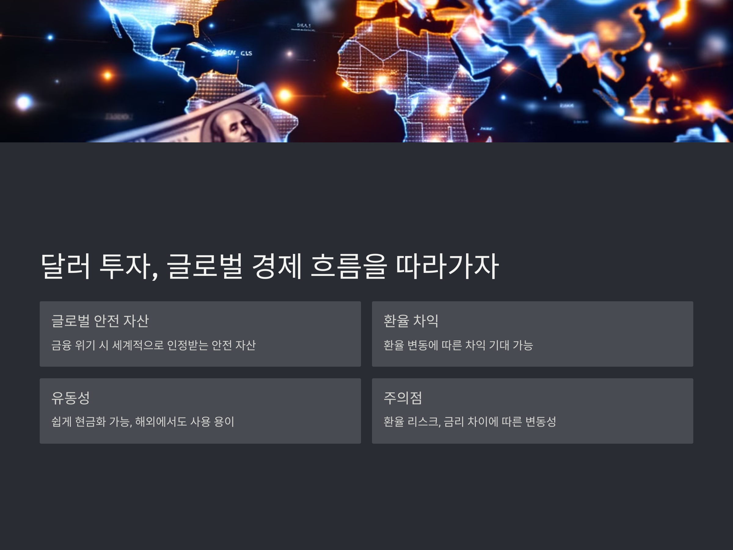 - 글로벌 안전 자산: 금융 위기 시에도 달러는 세계적으로 인정받는 안전 자산입니다.