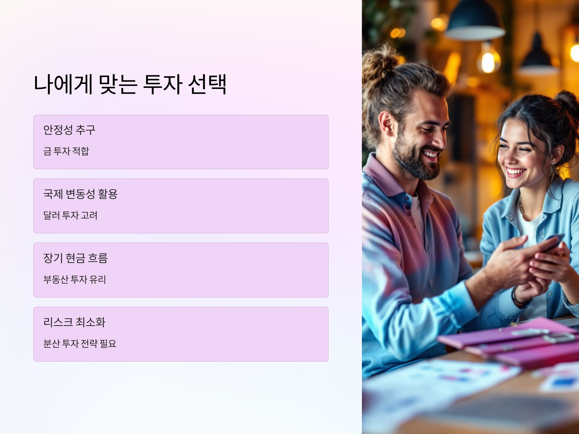 노후 대비를 위한 투자에서 가장 중요한 것은 자신에게 맞는 투자 전략을 선택하는 것입니다. 금, 달러, 부동산 각각의 특성과 리스크를 잘 이해하고, 자신이 원하는 목표를 달성할 수 있는 자산을 선택하는 것이 중요합니다. 만약 리스크를 최소화하고 싶다면 금이나 달러에 분산 투자하는 것도 좋은 방법입니다. 반면, 장기적인 수익을 추구한다면 부동산에 집중할 수 있습니다.