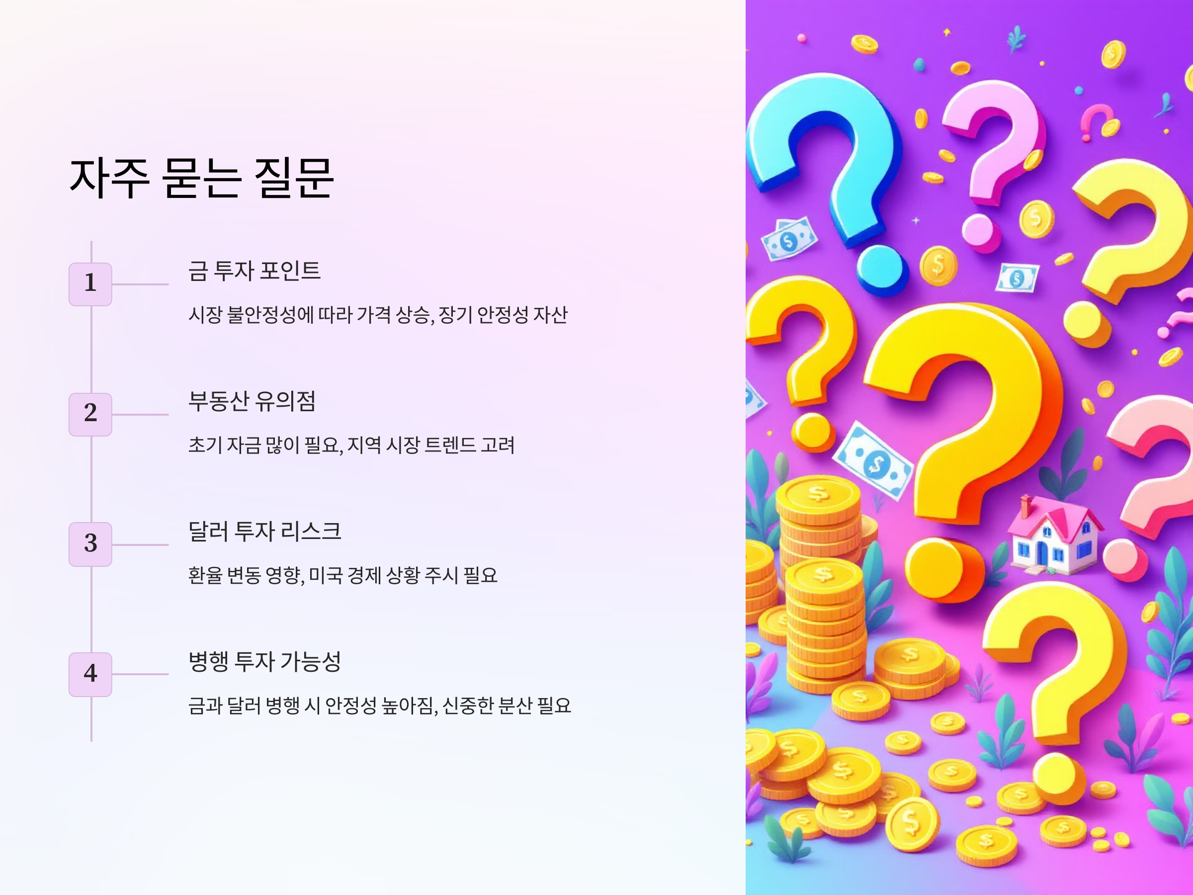 금, 달러, 부동산은 각각 다른 특성을 가진 자산이므로, 각각의 장단점을 잘 이해한 후 선택하는 것이 중요합니다. 금은 안정성 측면에서 매우 우수하지만, 수익성이 낮은 특성이 있습니다. 달러는 환율 변동에 따라 유리한 시점에 투자하면 높은 수익을 기대할 수 있지만, 미국 경제의 영향을 크게 받는다는 점이 리스크입니다. 부동산은 장기적으로 안정적인 수익을 얻을 수 있는 자산이지만, 초기 투자금이 크고 유동성이 낮다는 단점이 있습니다.