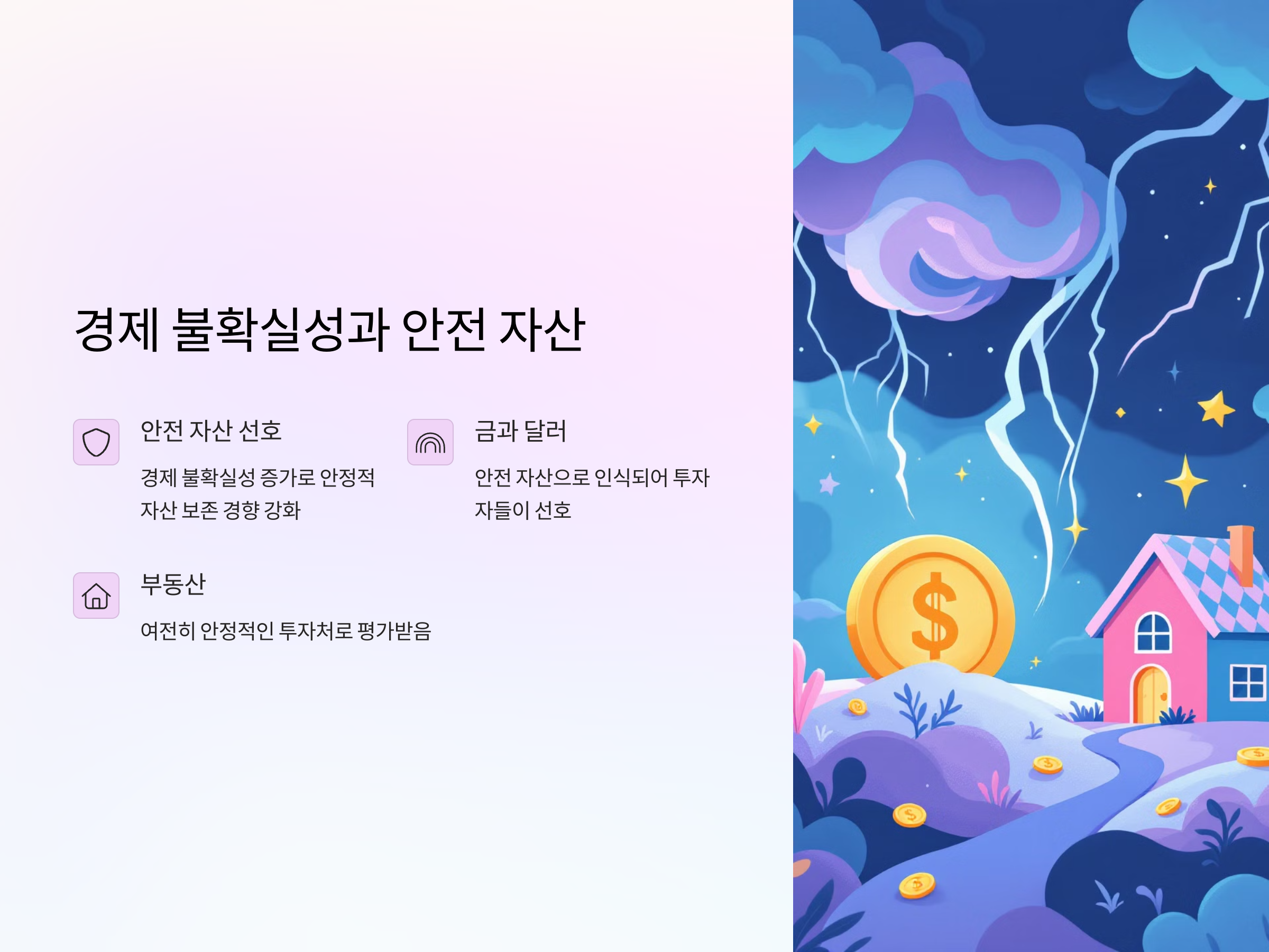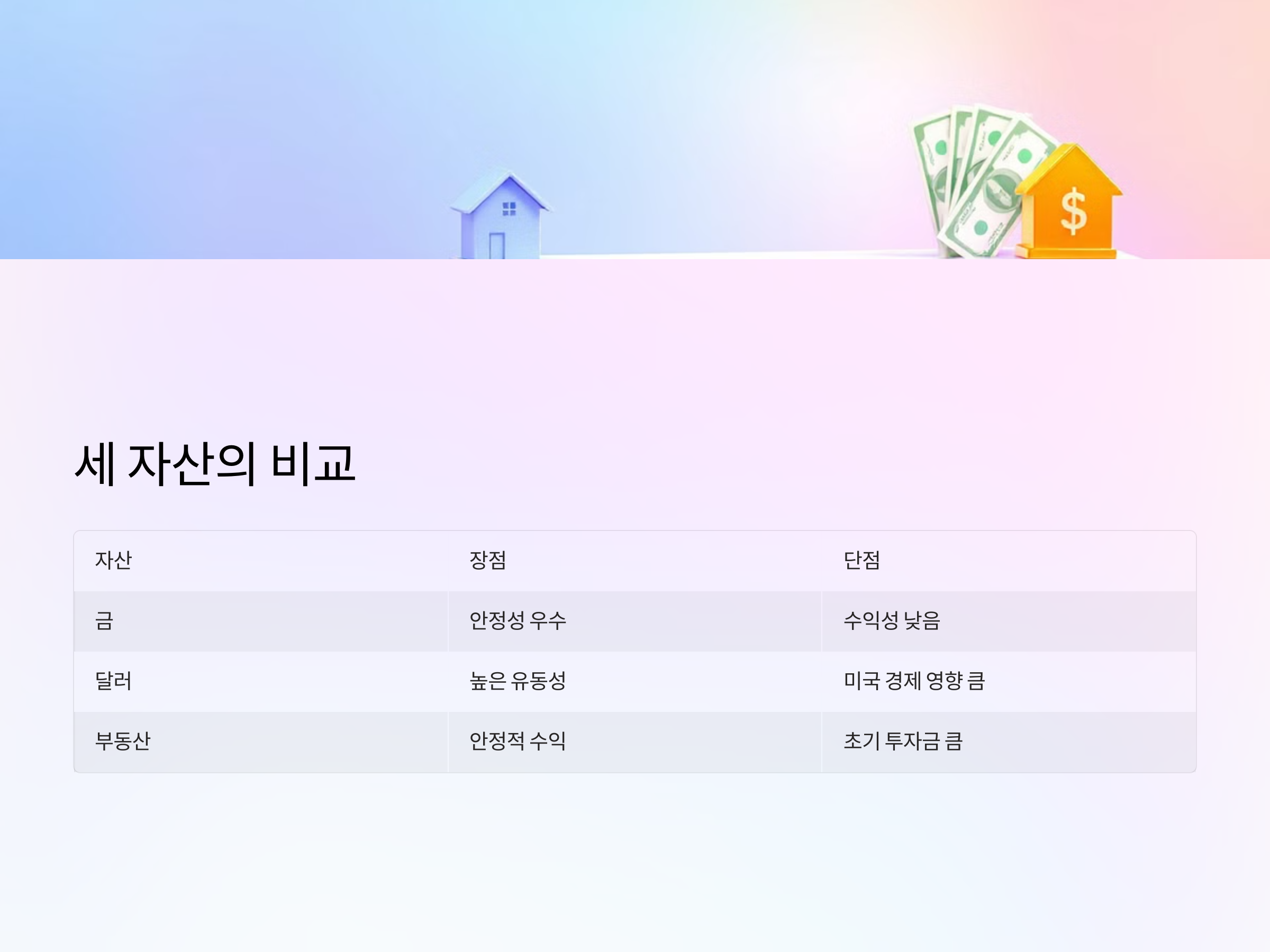 부동산의 가장 큰 장점은 실물 자산이라는 점으로, 금이나 달러처럼 단기적인 변동성에 크게 영향을 받지 않고, 안정적인 가치를 유지하는 경우가 많습니다. 하지만, 부동산은 초기 투자금이 크고, 매매가 어려운 단점이 있습니다. 또한, 시장의 변동성에 따라 가격이 하락할 위험도 존재합니다.