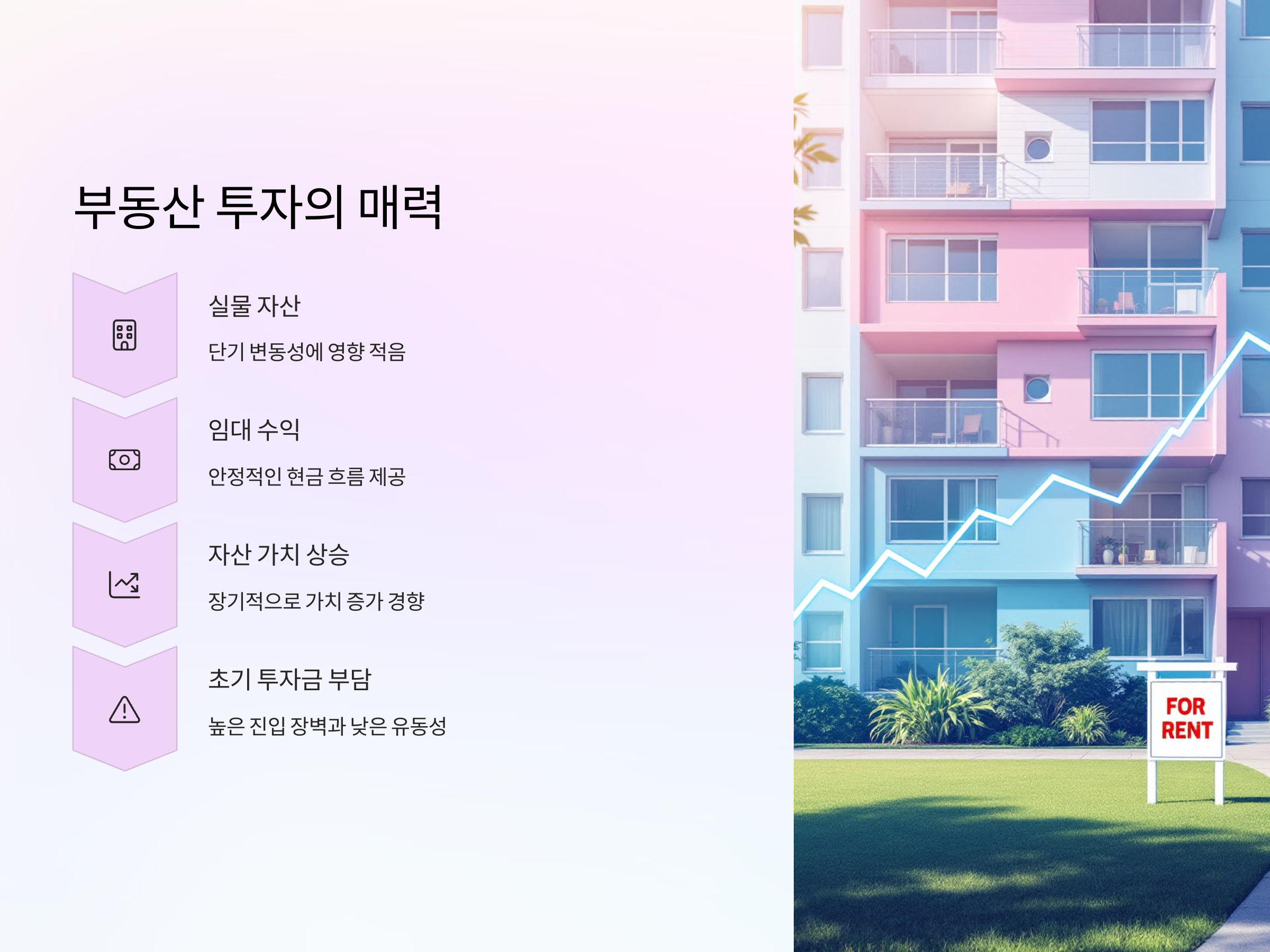 부동산은 초기 자금이 많이 드는 자산으로, 시장의 변동성에 따라 가격이 크게 변동할 수 있습니다. 따라서, 지역적인 시장 트렌드와 향후 개발 계획 등을 고려해 신중히 투자 결정을 내려야 합니다.