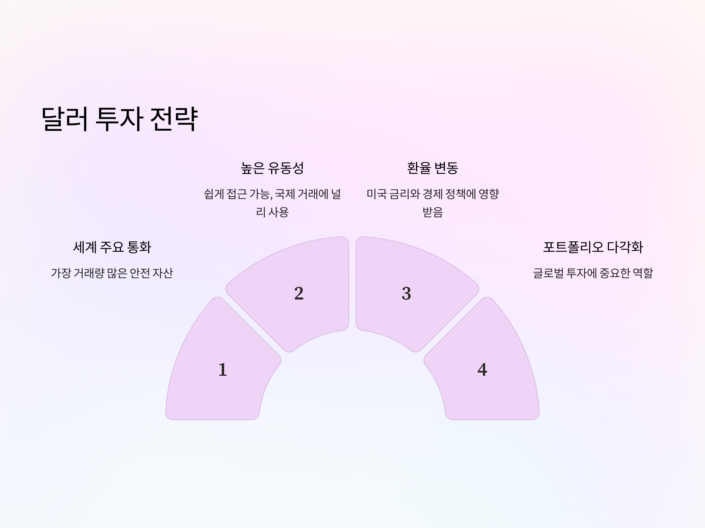달러는 세계에서 가장 거래량이 많은 통화로, 안전 자산으로서의 특성을 갖고 있습니다. 특히 경제 불안정 시기에 투자자들이 선호하는 자산 중 하나로, 달러 가치는 글로벌 금융 위기나 지역적인 경제 위기 때 상승하는 경향이 있습니다. 또한, 달러는 세계 경제의 주요 통화로, 글로벌 투자 포트폴리오의 다각화 측면에서도 중요한 역할을 합니다.