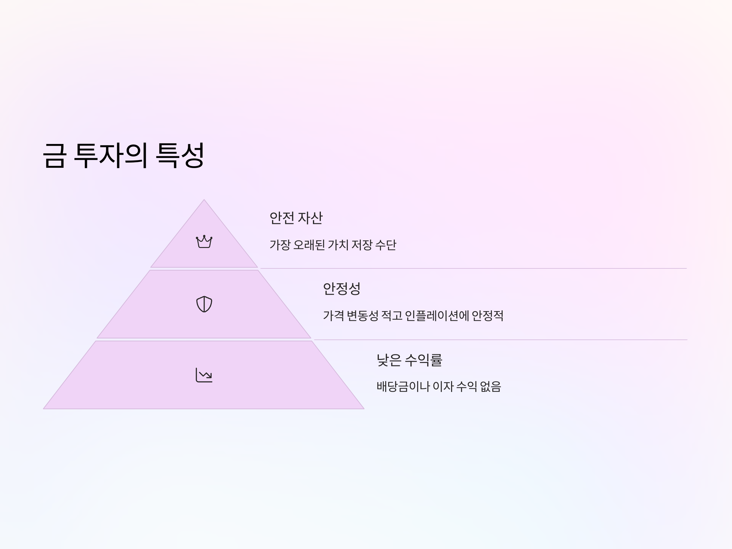 금은 역사적으로 가장 오래된 가치 저장 수단으로, 금융 위기나 경제 불안정 시기에 많은 투자자들이 금을 안전 자산으로 찾습니다. 금은 다른 자산들보다 가격 변동성이 적고, 인플레이션에도 비교적 안정적인 특성을 지니고 있습니다. 특히 물가 상승률이 높아질 때, 금 가격은 상승하는 경향이 있어 인플레이션 헷지(hedge) 역할을 할 수 있습니다.