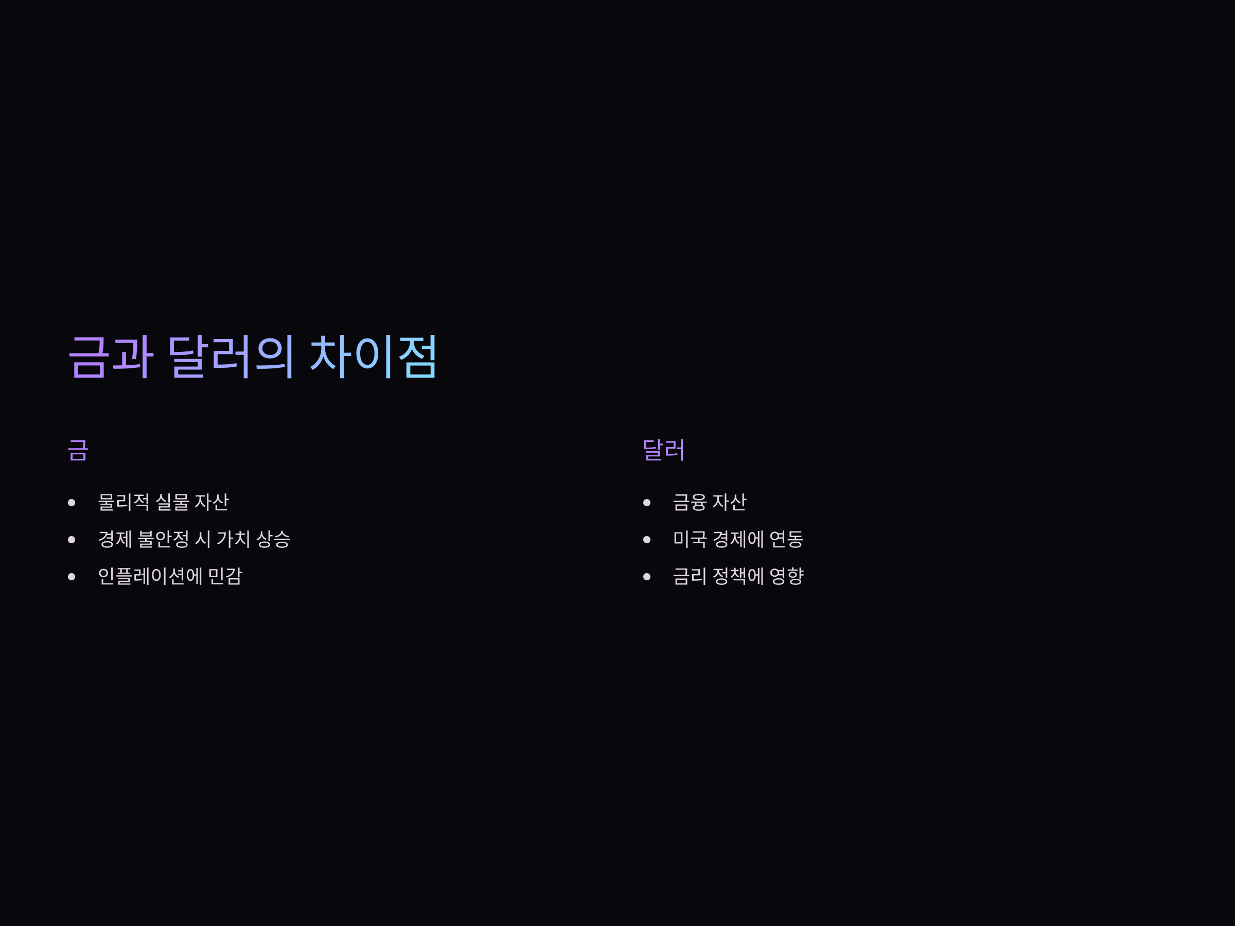 금은 역사적으로 불안정한 경제 상황에서 안전 자산으로 알려져 왔습니다. 반면, 달러는 미국 경제와 밀접한 연관이 있으며, 국제적으로 중요한 통화입니다. 두 자산 모두 안정적인 자산으로 간주되지만, 금은 인플레이션에 강하고, 달러는 경제 성장과 금리에 영향을 받습니다.