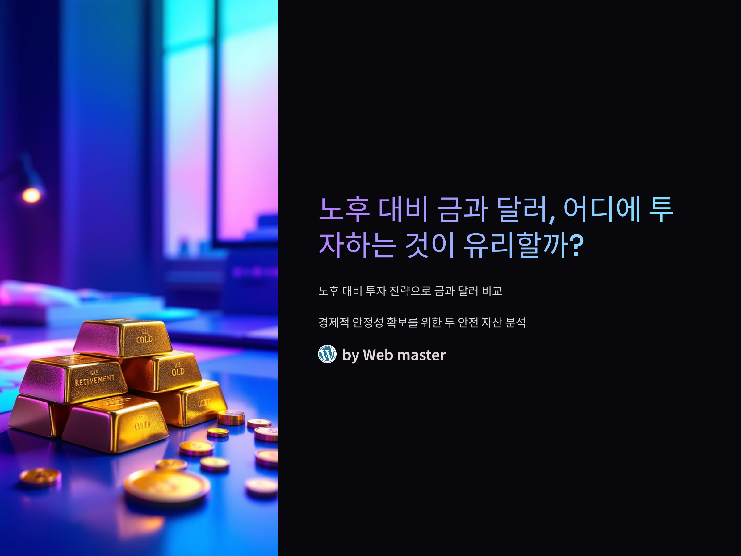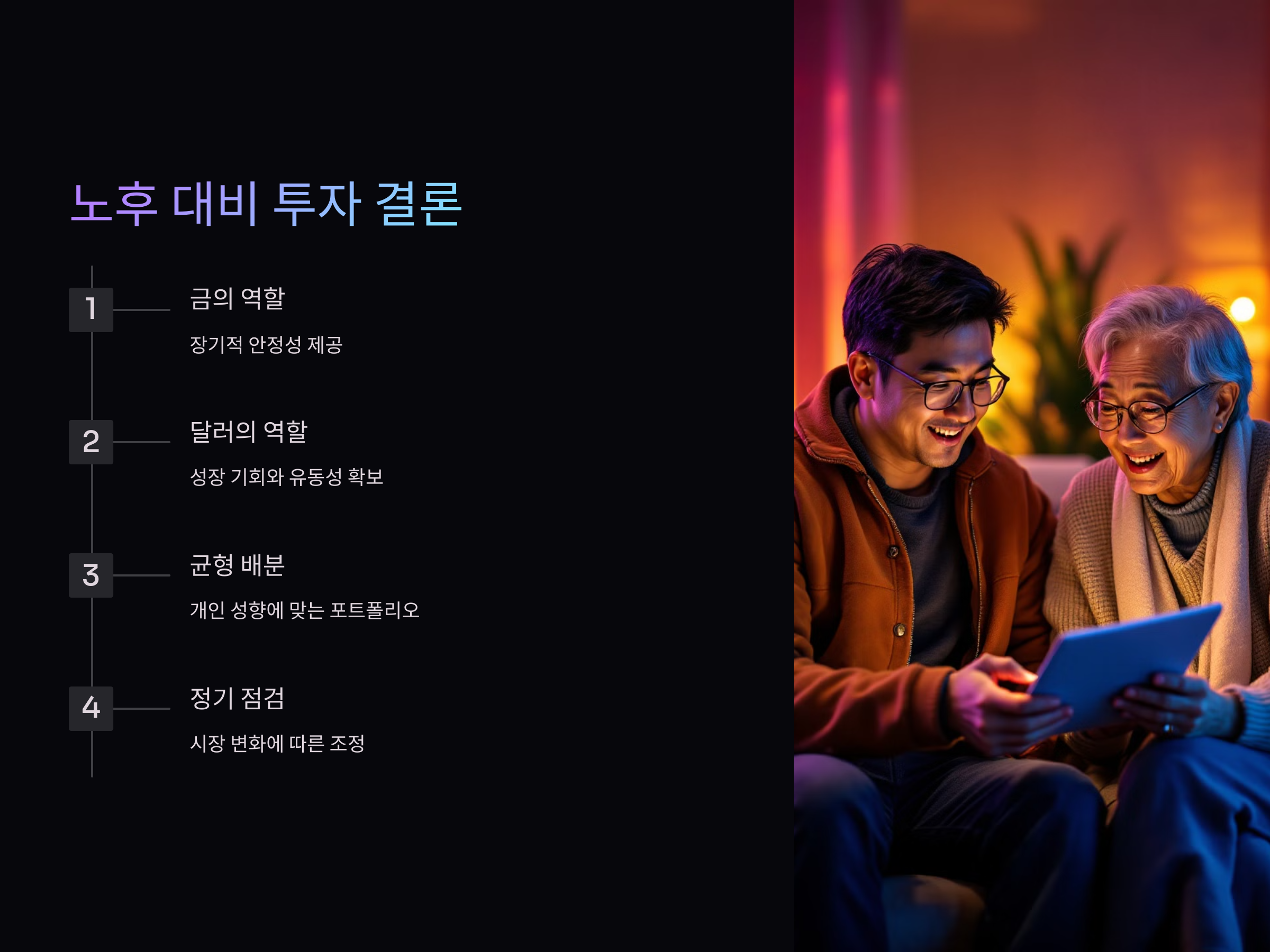 노후 대비를 위한 최적의 투자 전략은 금과 달러를 적절히 배분하여, 장기적인 안정성과 유동성을 동시에 확보하는 것입니다. 또한, 개인의 투자 성향과 시장의 변화에 따라 유연한 포트폴리오 조정이 필요합니다. 이를 통해 불확실한 미래에서도 안정적인 노후 자산을 마련할 수 있을 것입니다.