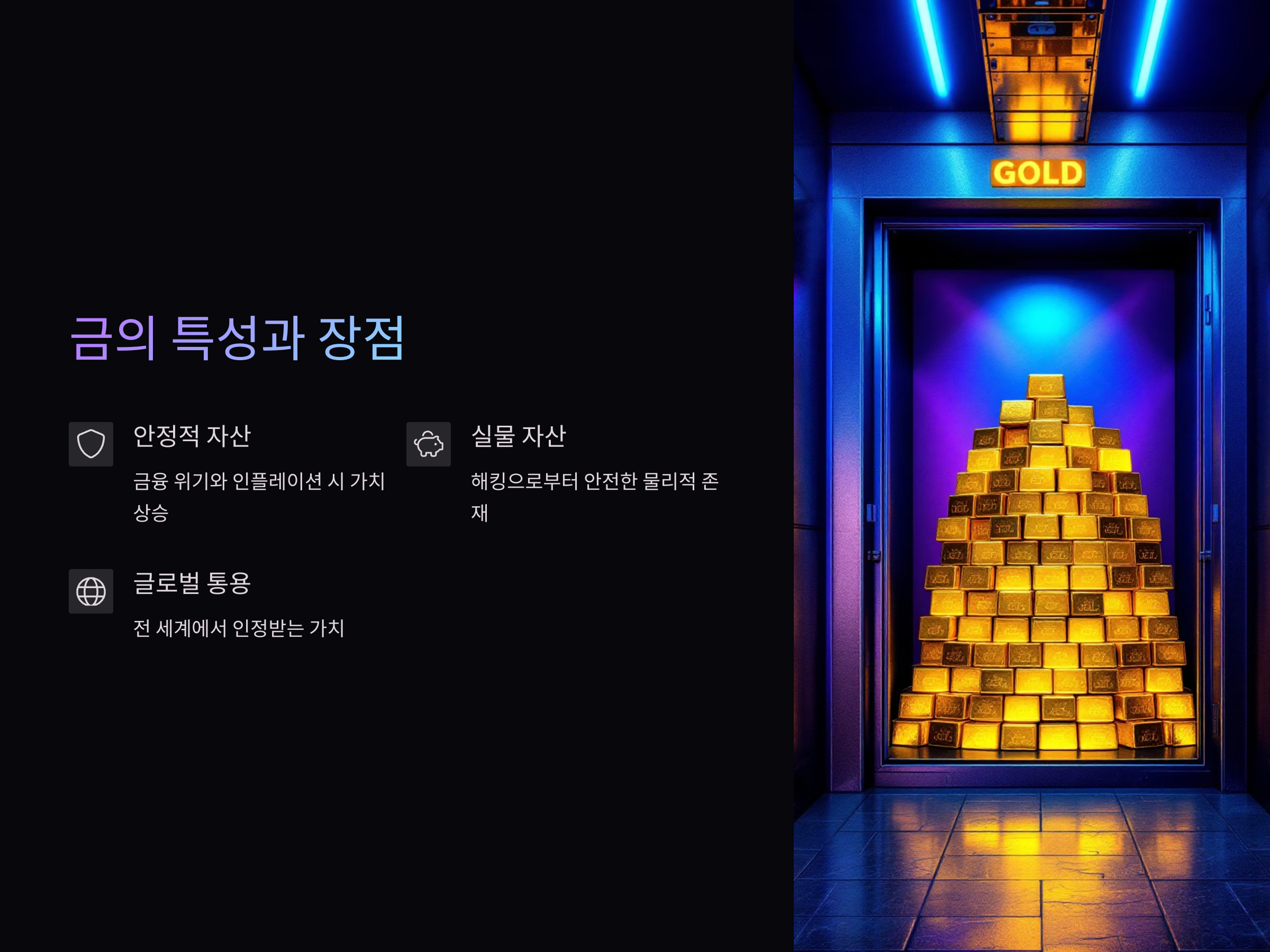 금의 주요 장점 중 하나는 실물 자산으로, 물리적으로 존재하기 때문에 다른 금융 자산과는 다르게 전산 시스템의 문제나 해킹으로부터 안전하다는 점입니다. 또한 금은 항상 수요가 존재하고, 전 세계에서 통용되는 자산이기 때문에 글로벌 경제 불안정성 속에서도 일정한 가치를 유지할 수 있습니다.