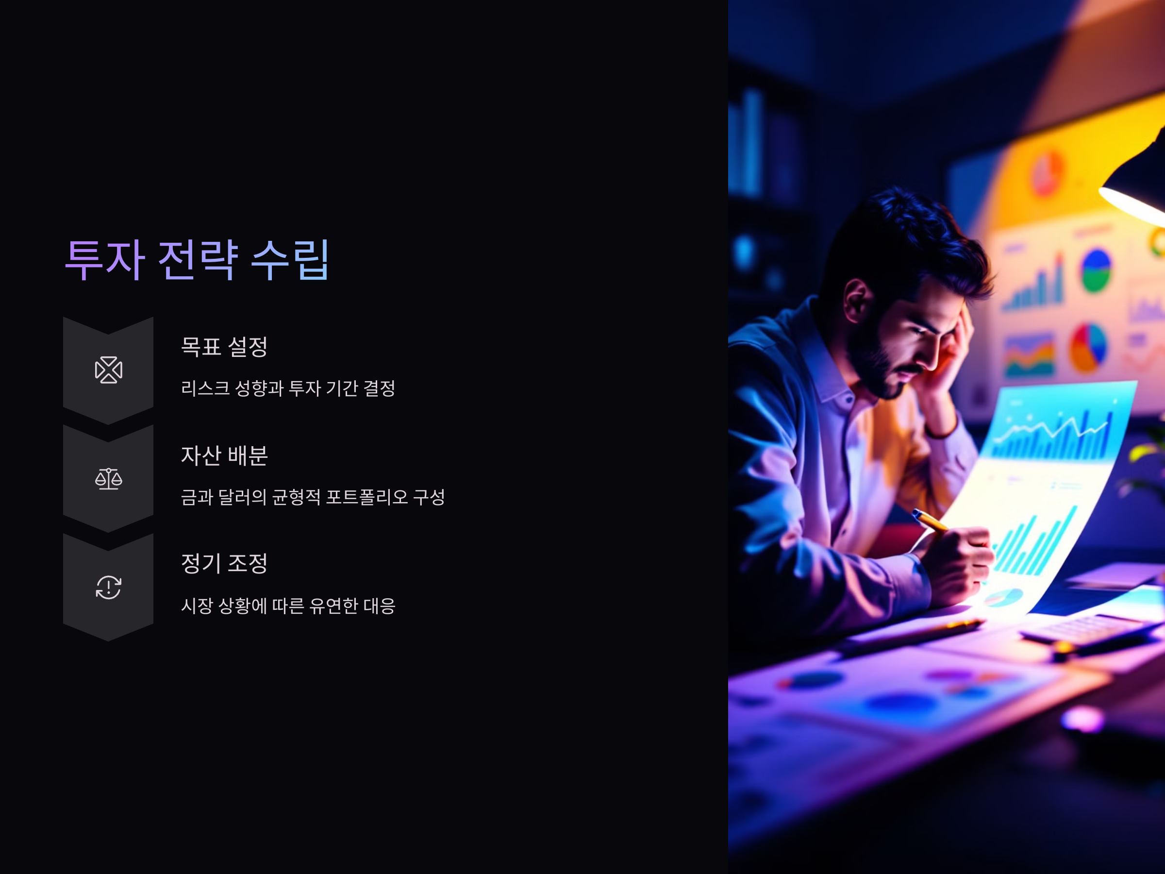 금과 달러의 비율은 개인의 투자 성향과 리스크 수용 능력에 따라 다르지만, 안정적인 포트폴리오를 만들기 위해서는 두 자산을 균형 있게 배분하는 것이 중요합니다. 예를 들어, 금 60%, 달러 40%로 배분하여 안정성과 성장성을 동시에 추구할 수 있습니다.