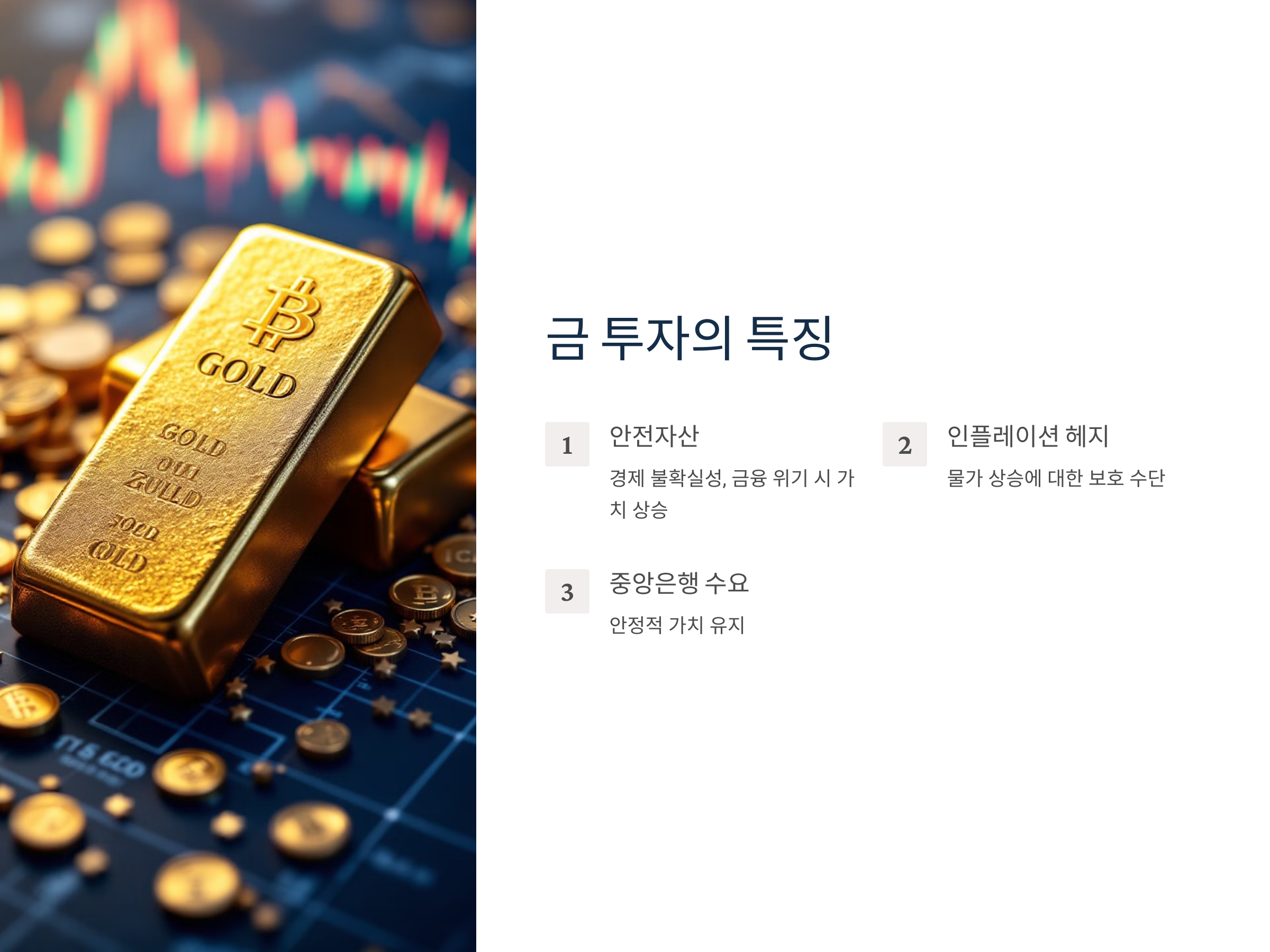 - 인플레이션 헤지: 금은 물가 상승에 대한 헤지 수단으로 유효합니다.