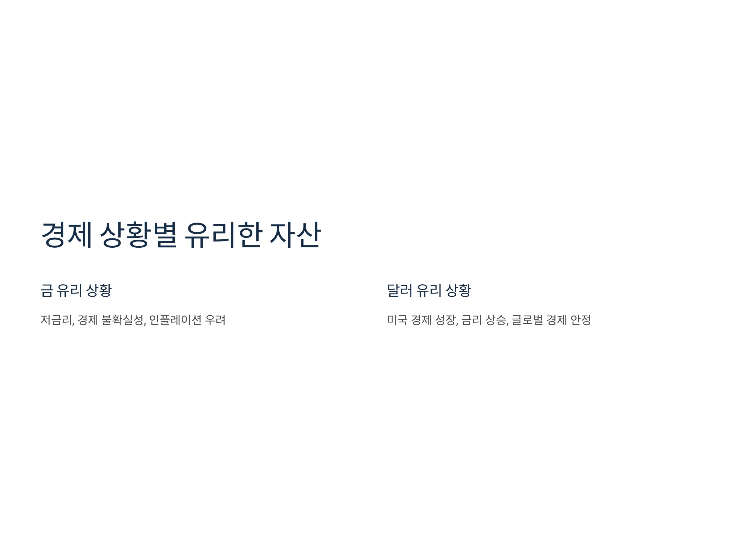 금과 달러는 각기 다른 경제 환경에서 두각을 나타냅니다. 금은 주로 경제 불확실성이 클 때, 예를 들어 금융위기나 정치적 불안이 있을 때 강세를 보입니다. 반면 달러는 안정적인 경제 환경에서, 특히 금리가 상승하는 시기에 유리한 성과를 보입니다. 따라서 두 자산은 각기 다른 환경에서 유리한 특성을 발휘하므로, 노후 대비 투자에서는 경제 상황에 맞춰 적절한 자산 배분이 필요합니다.