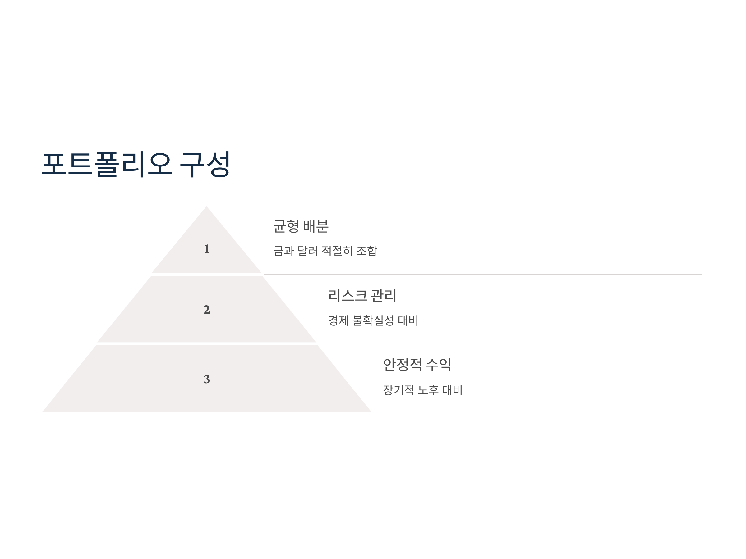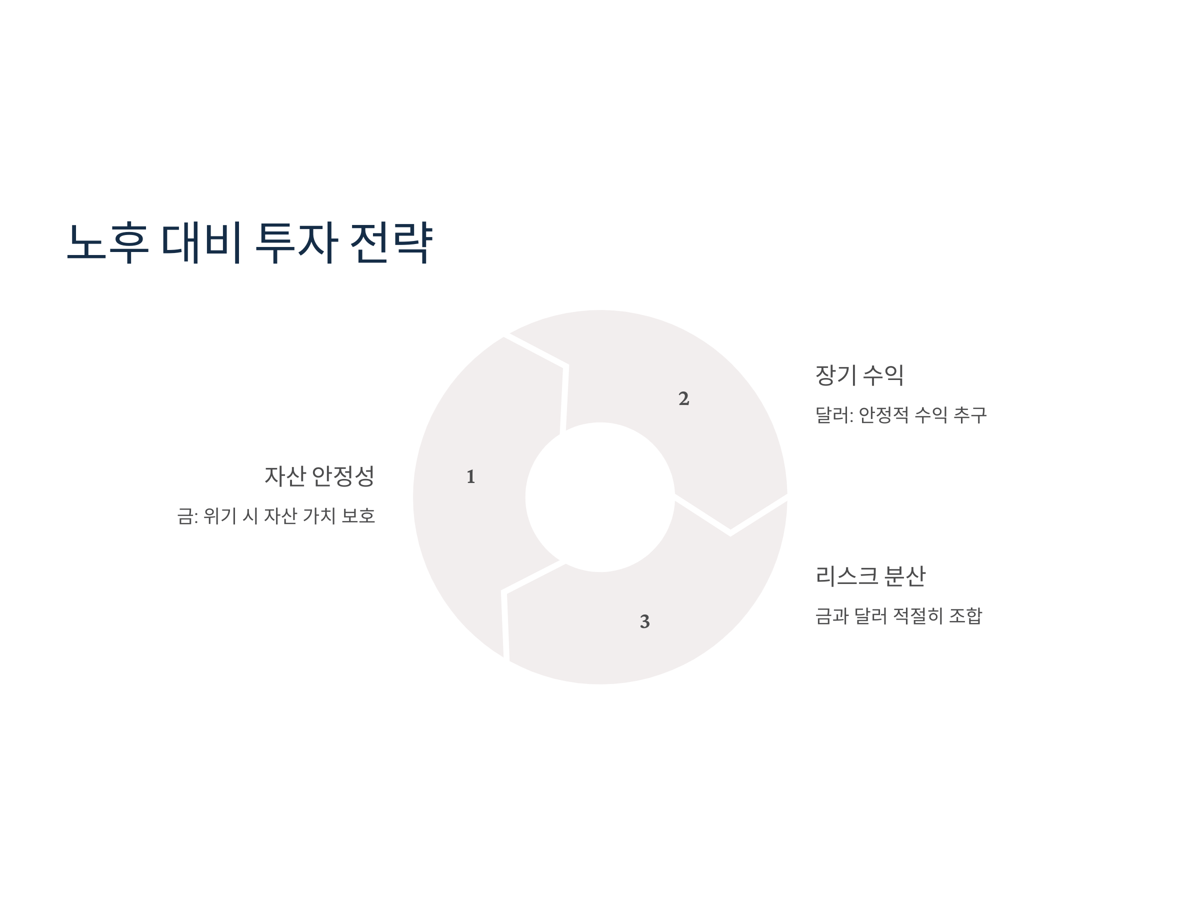 노후 대비 투자에서는 자산의 안정성과 장기적인 수익을 모두 고려해야 합니다. 금과 달러 각각의 장점은 있지만, 이들 자산에 대한 투자 전략은 다르게 설정해야 합니다. 금은 안전자산으로서 위기 상황에서 자산 가치를 지킬 수 있는 특성이 있지만, 지속적인 수익을 원할 경우 한계가 있을 수 있습니다. 반면, 달러는 안정적인 수익을 추구할 수 있지만, 환율 변동이나 미국 경제의 상황에 따라 변동성이 있을 수 있습니다.