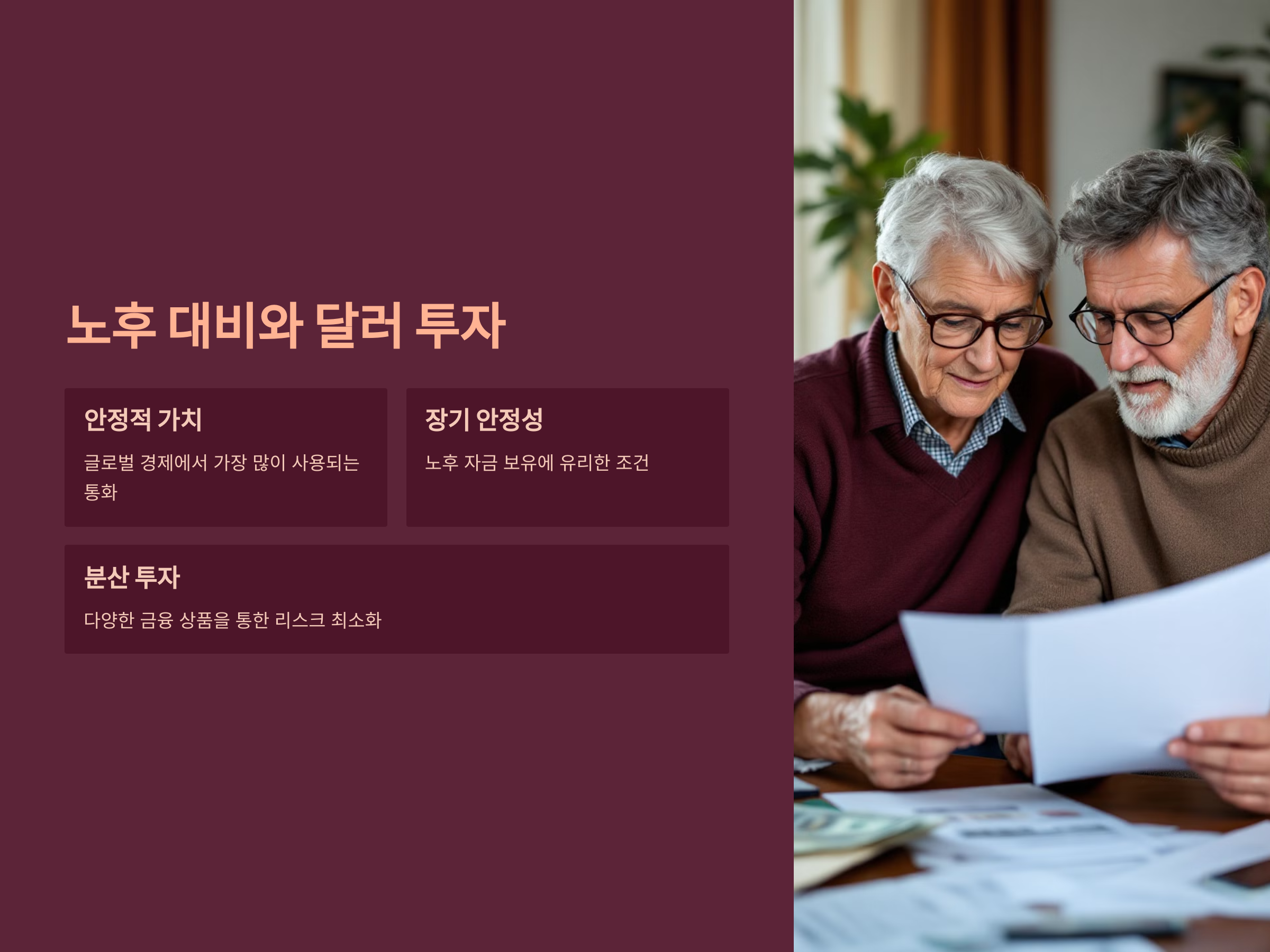 달러는 글로벌 경제에서 가장 많이 사용되는 통화로, 다른 통화보다 안정적인 가치를 유지할 가능성이 큽니다. 이는 특히 국제적인 금융 환경에서 노후 자금을 보유하는 데 유리한 조건을 만들어 줍니다.