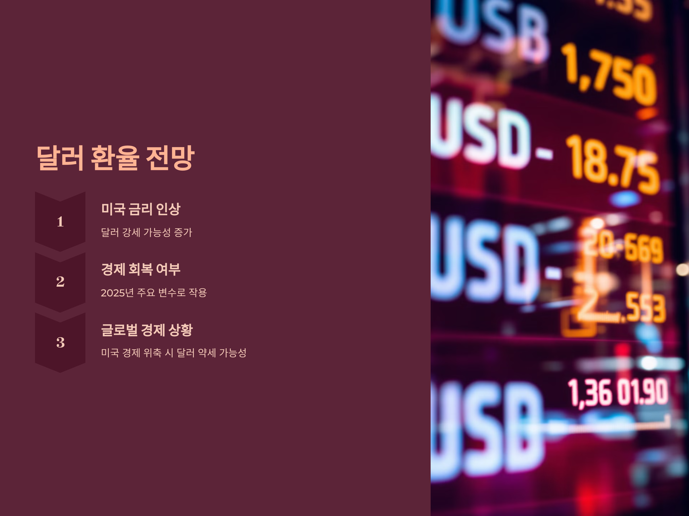 2025년을 앞두고 미국의 금리 인상과 경제 회복 여부가 주요 변수로 작용할 것으로 보입니다. 미국의 금리가 상승하면 달러의 강세가 지속될 가능성이 큽니다. 이는 달러를 보유하고 있는 사람들에게 긍정적인 영향을 미칠 수 있죠.