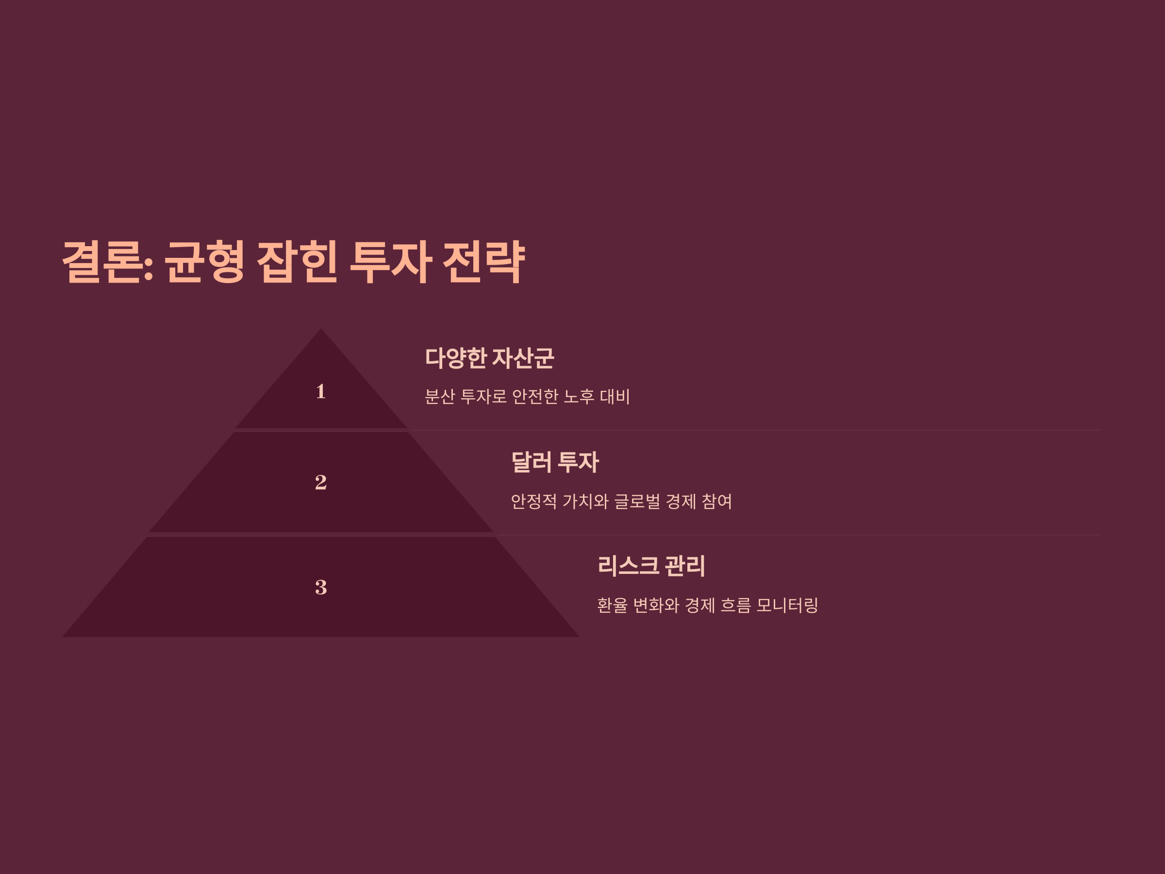 다만, 달러 투자에도 리스크가 존재하므로, 환율 변화나 글로벌 경제 흐름에 따라 유연하게 대응할 필요가 있습니다. 또한, 달러 투자만으로는 완전한 리스크 분산이 어려우므로, 다양한 자산군에 분산 투자하는 것이 더욱 안전한 노후 대비 전략이 될 것입니다.