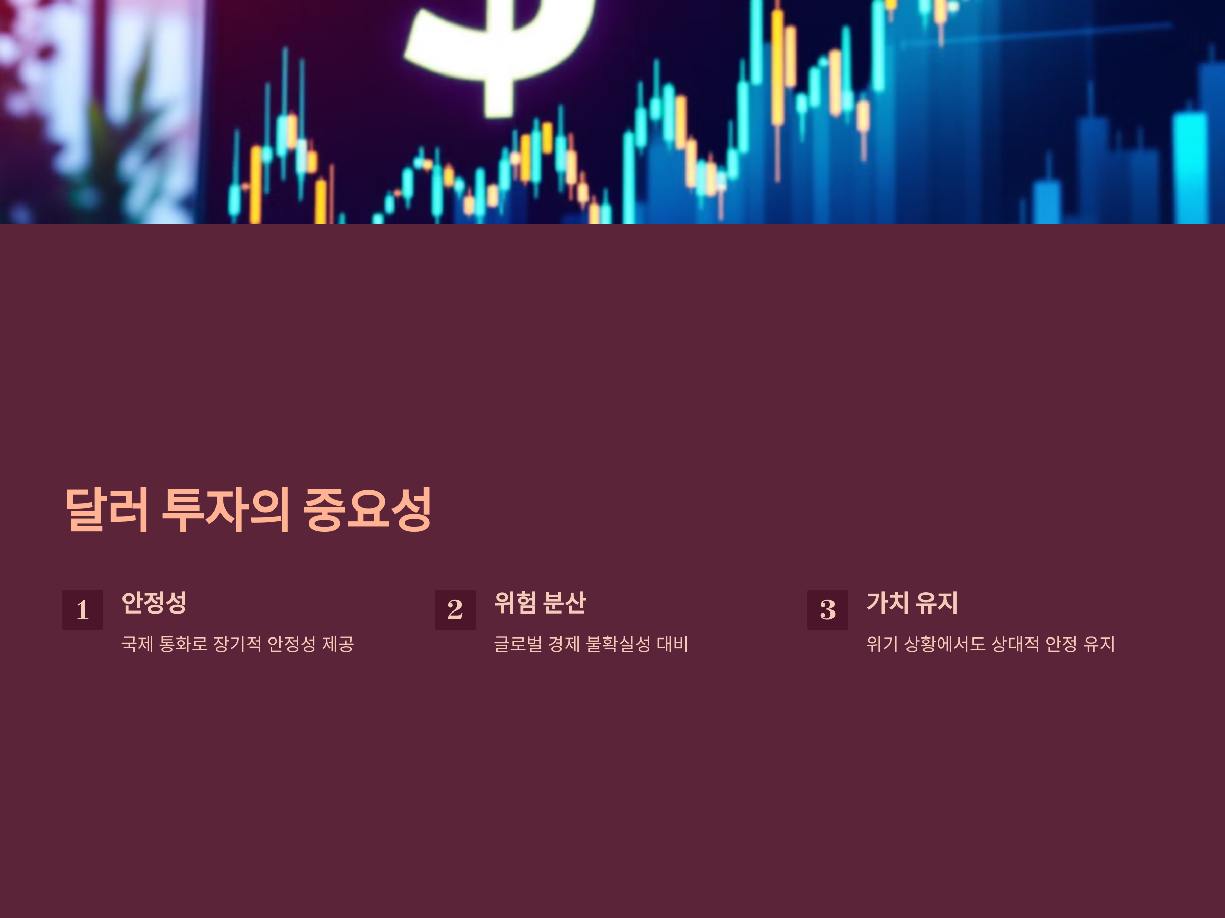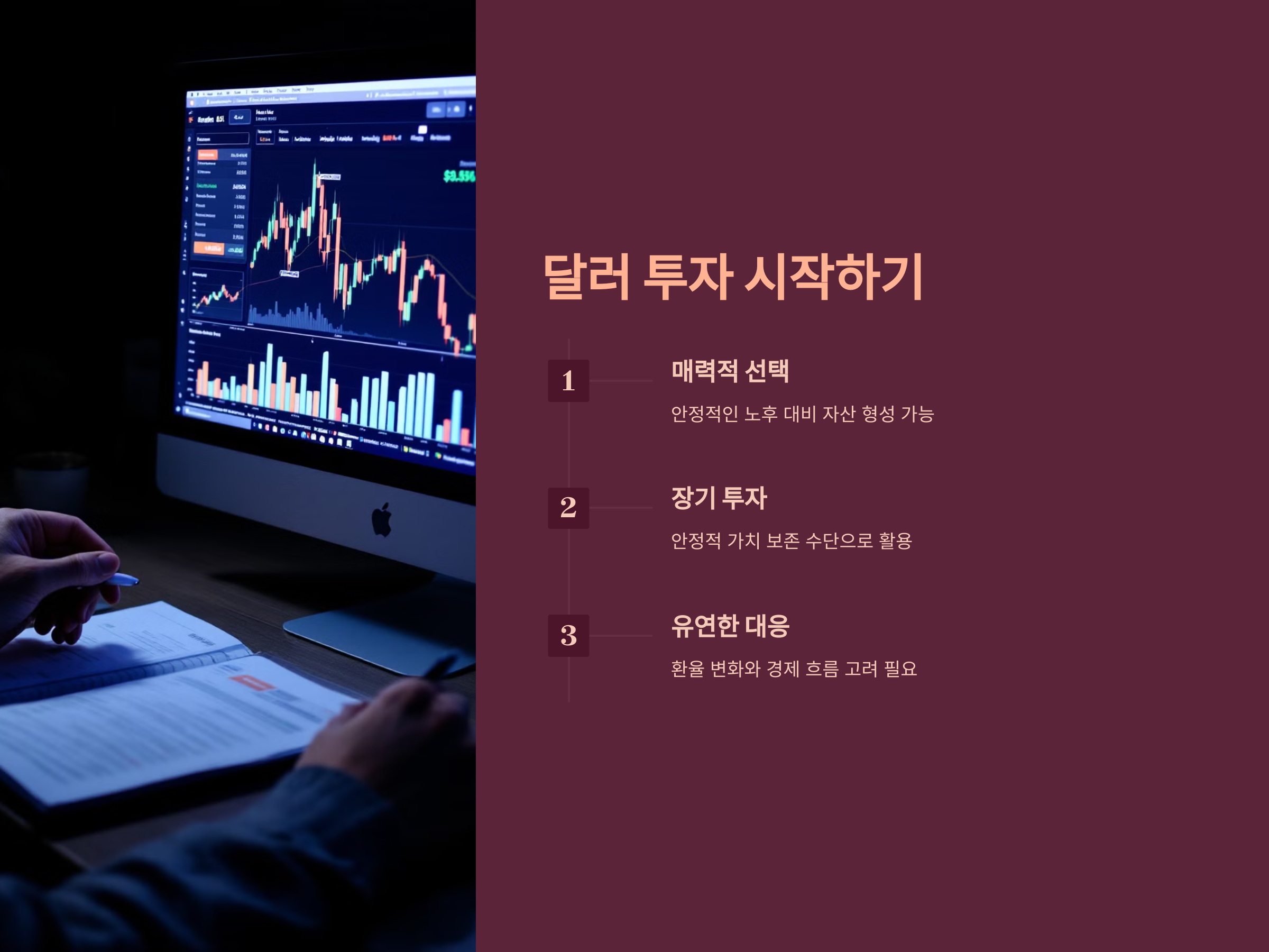특히 최근 몇 년간 글로벌 경제의 불확실성이 커짐에 따라, 많은 투자자들이 달러를 안전 자산으로 보고 투자하고 있습니다. 달러는 위기 상황에서도 상대적으로 안정적인 가치를 유지하는 특성이 있기 때문에, 장기적으로 봤을 때 위험을 분산시키고 노후 대비에 유리할 수 있습니다.