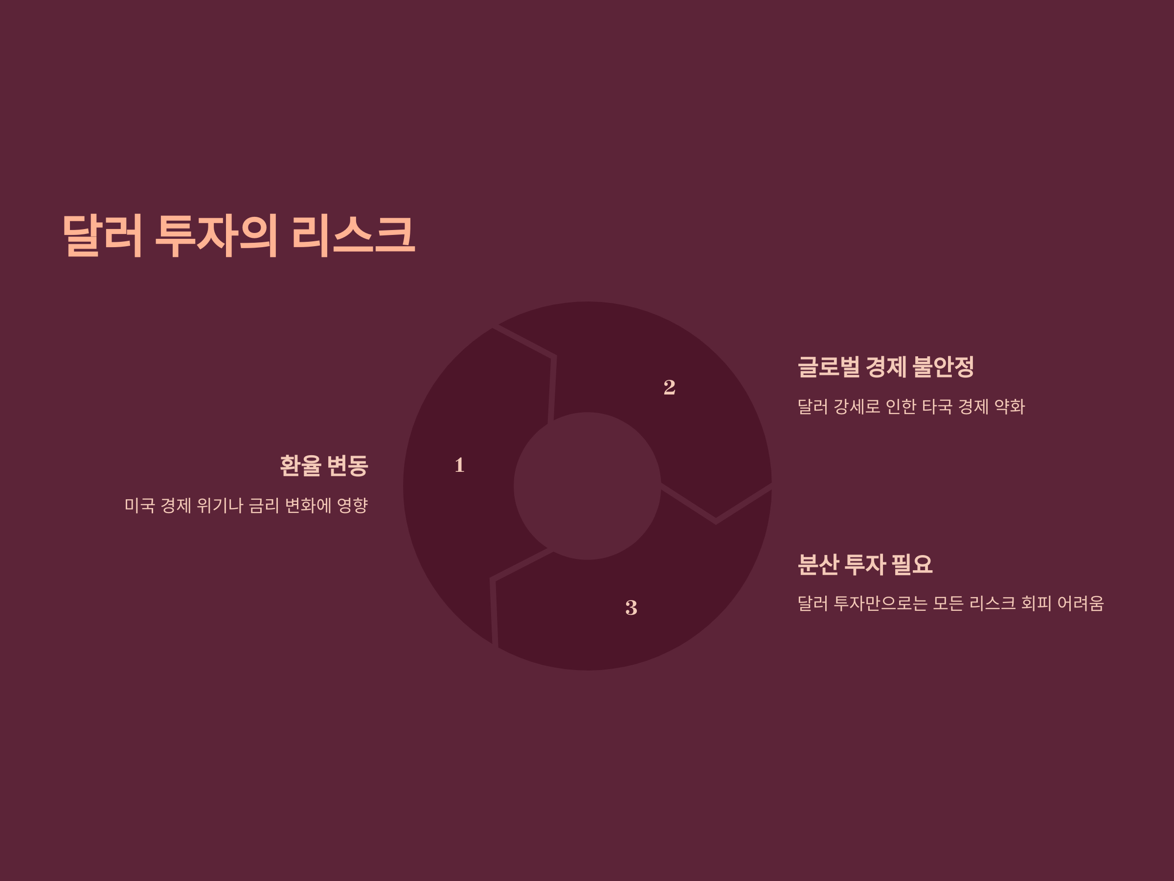 달러가 안정적인 자산으로 여겨지긴 하지만, 리스크가 없는 것은 아닙니다. 달러는 다른 국가의 통화보다 상대적으로 안정적일 수 있지만, 여전히 환율 변동에 따라 큰 영향을 받을 수 있습니다. 예를 들어, 미국의 경제 위기나 금리 변화, 또는 다른 국가들의 통화정책이 달러의 가치에 영향을 미칠 수 있습니다.