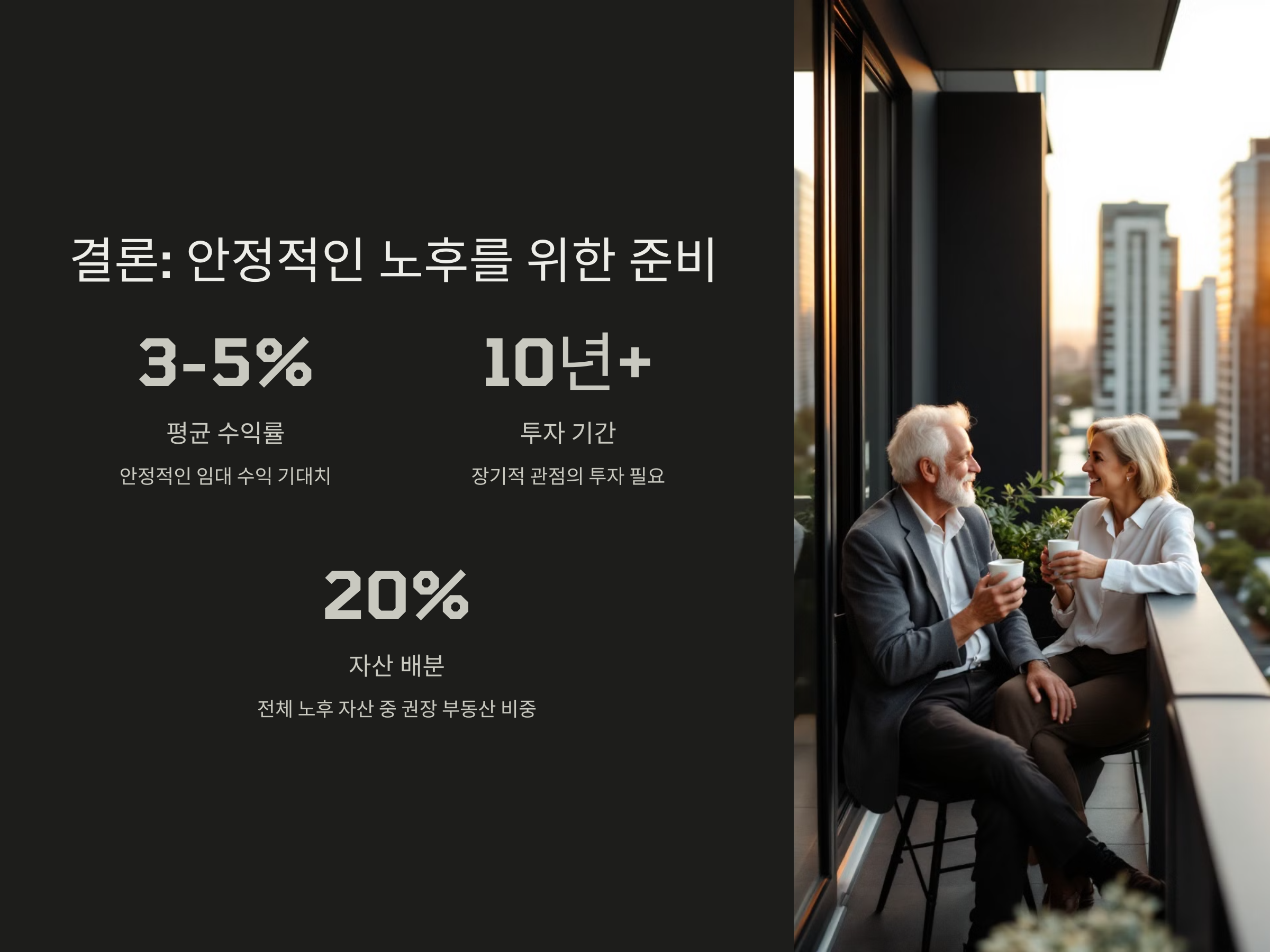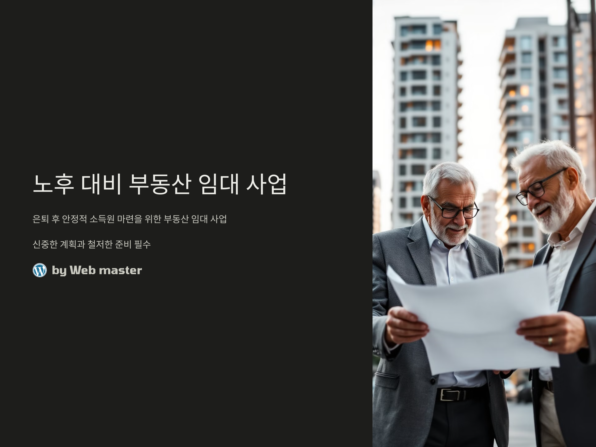 부동산 임대 사업은 노후 대비를 위한 효과적인 소득원 중 하나입니다. 그러나 성공적인 투자를 위해서는 철저한 시장 조사, 신중한 부동산 선택, 체계적인 리스크 관리, 그리고 세금 및 법적 사항에 대한 충분한 이해가 필요합니다. 이러한 요소들을 고려하여 계획을 수립한다면, 안정적인 노후 생활을 위한 든든한 기반을 마련할 수 있을 것입니