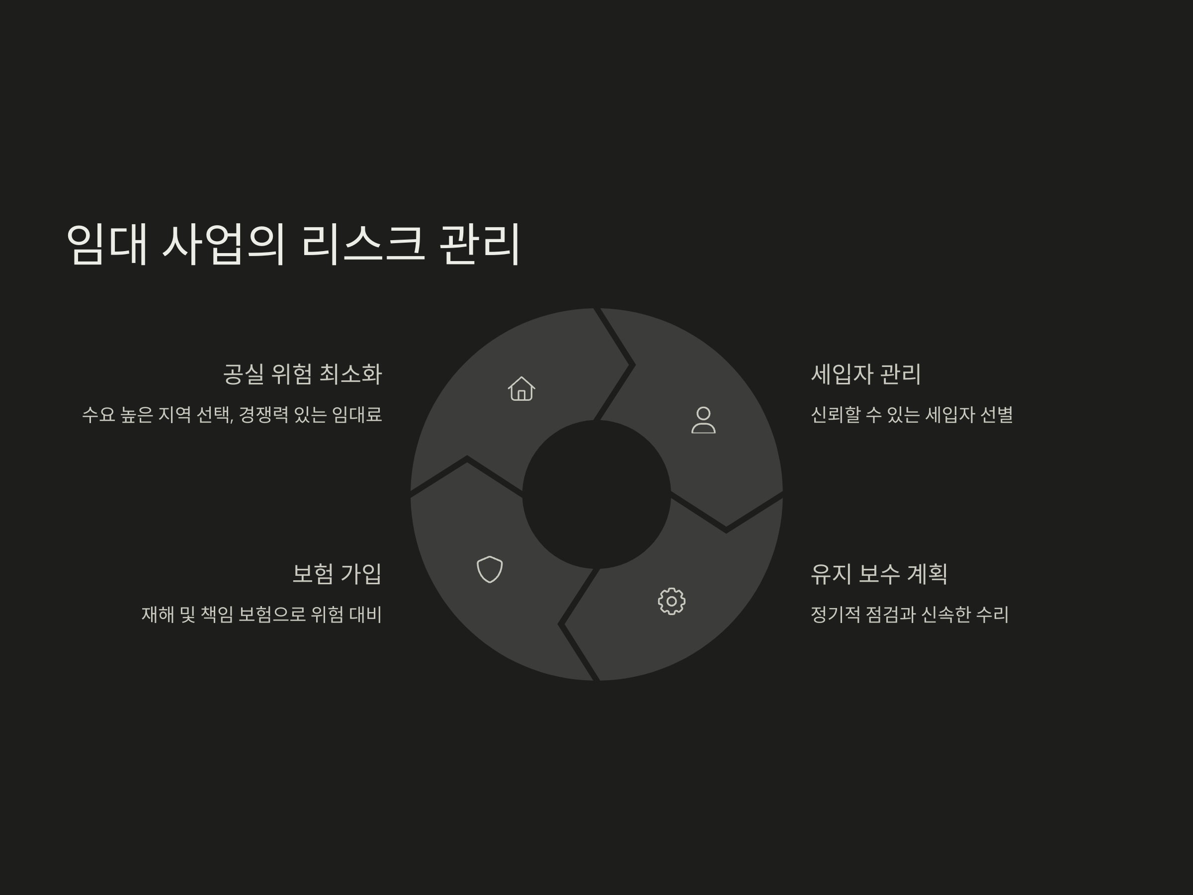 - 공실 위험 최소화: 임대 수요가 꾸준한 지역을 선택하고, 경쟁력 있는 임대료를 책정합니다.