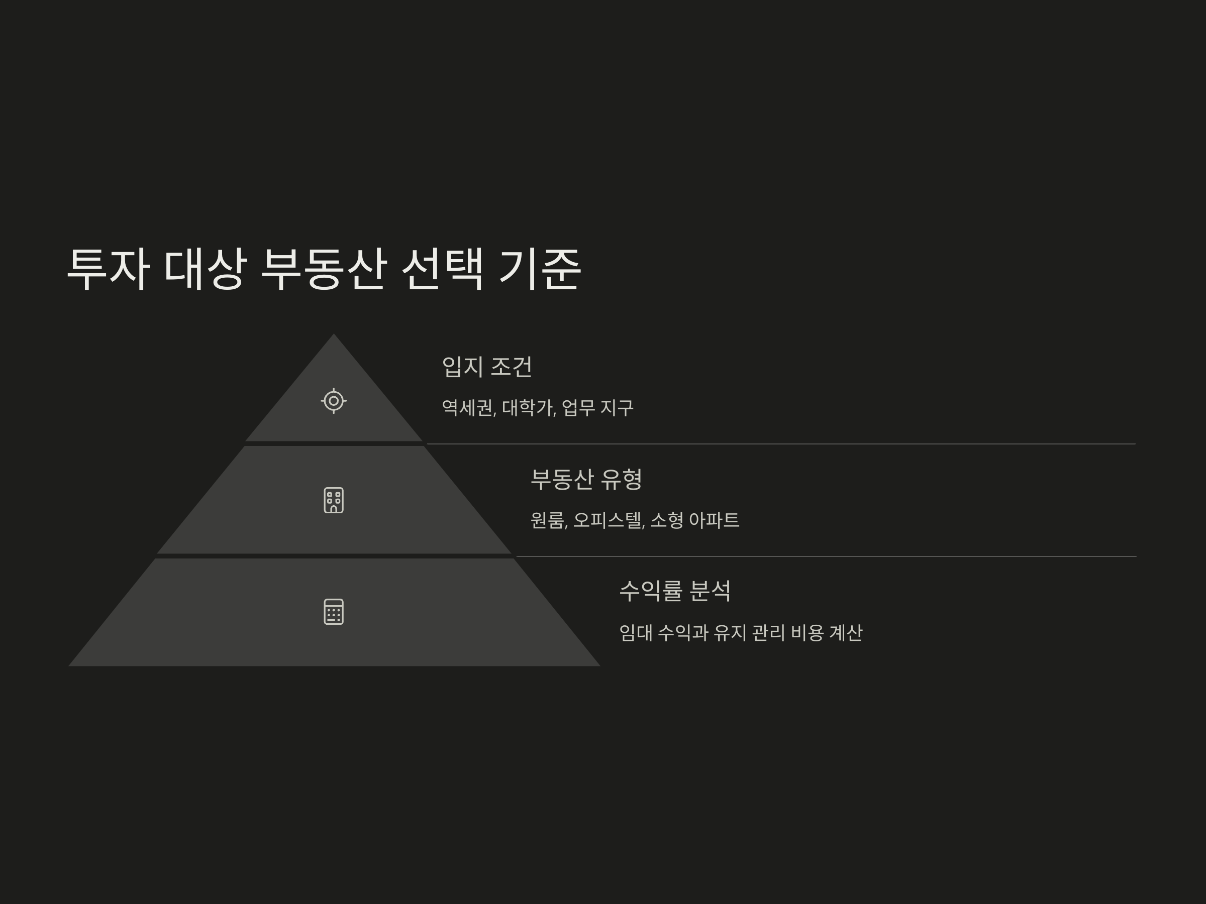 - 부동산 유형: 원룸, 오피스텔, 소형 아파트 등 관리가 용이하고 공실 위험이 낮은 유형을 고려합니다.