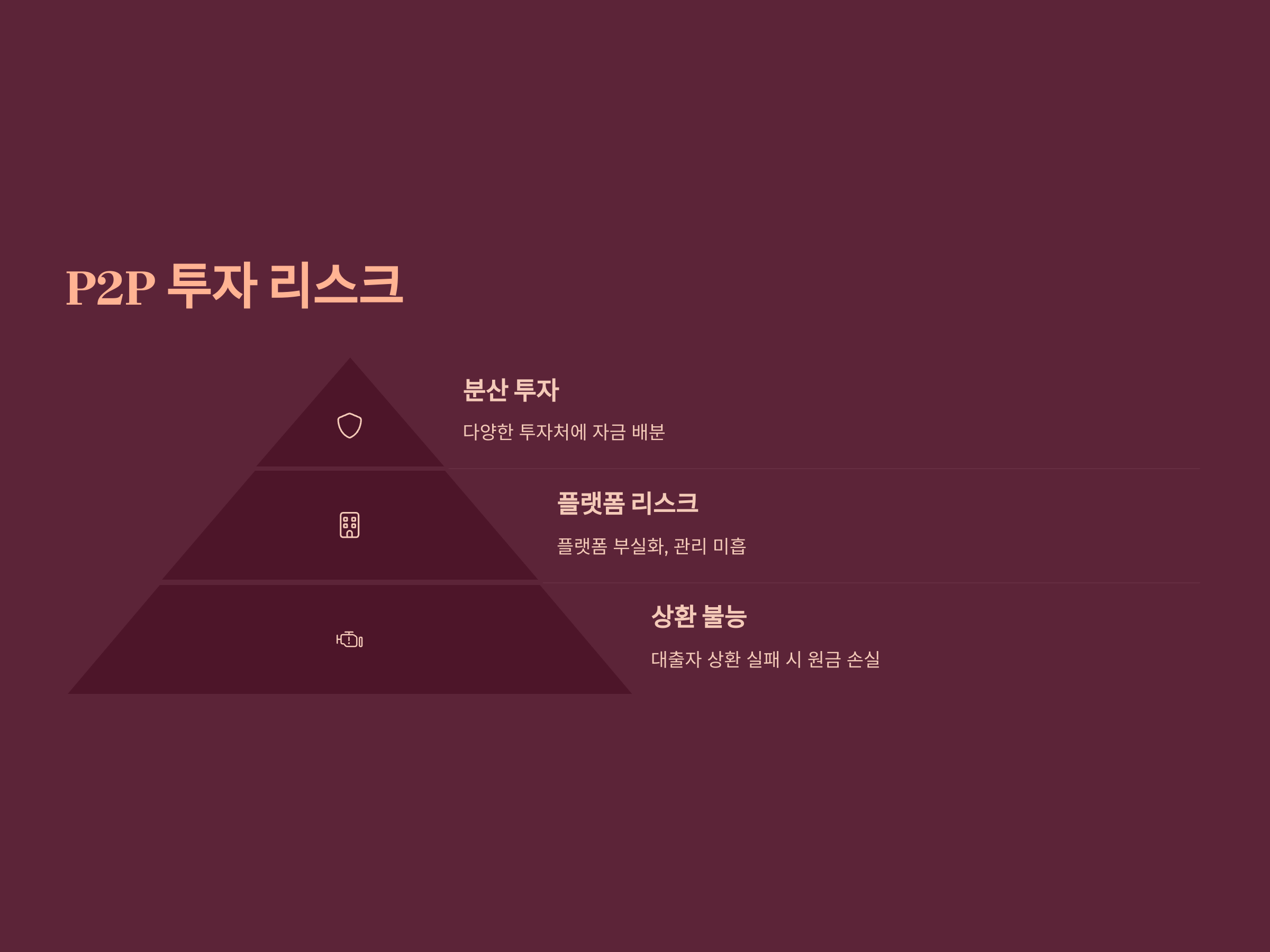 - 플랫폼 리스크: P2P 투자 플랫폼 자체가 부실해지거나, 관리가 미흡할 경우 투자자에게 큰 손실이 발생할 수 있습니다.