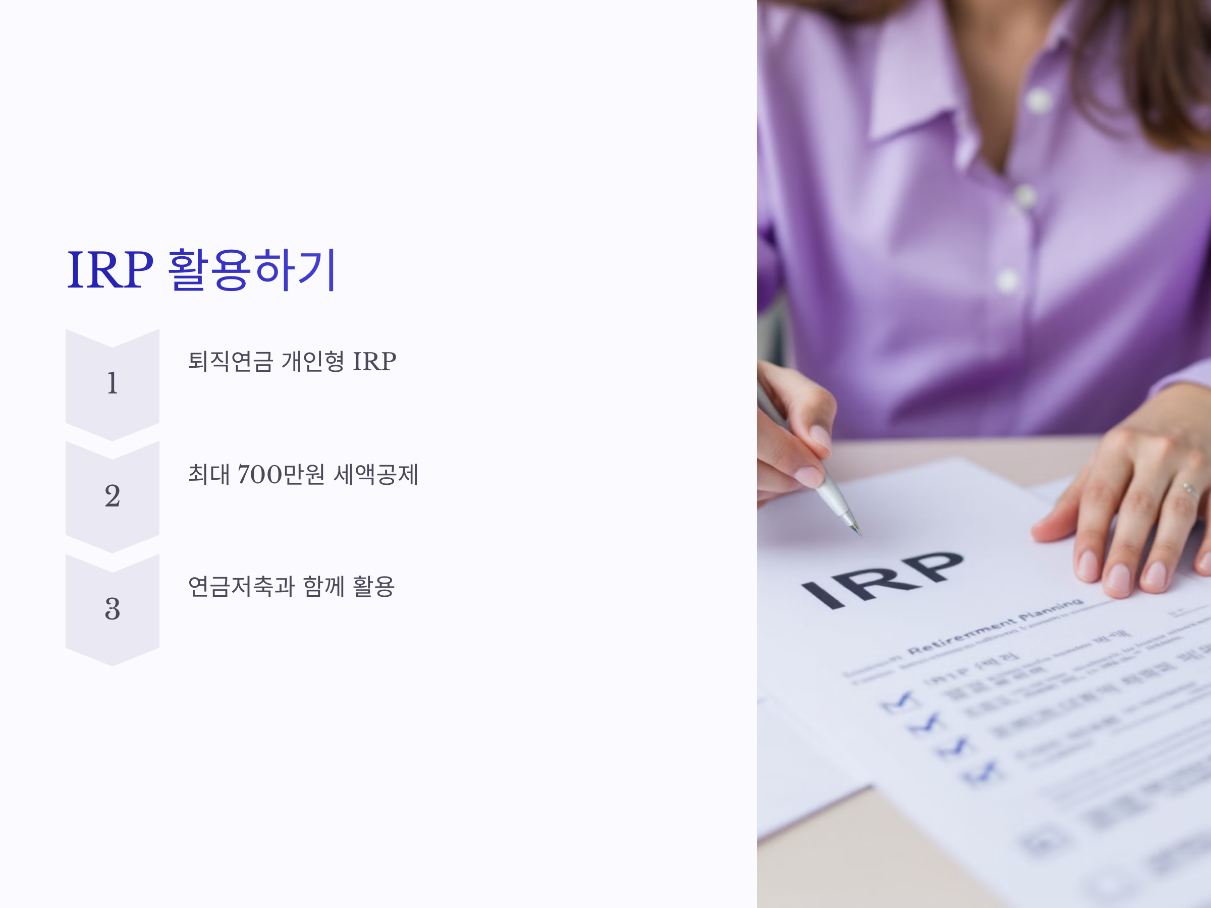 IRP는 퇴직연금 개인형 IRP를 의미하며, 퇴직 후 수령하는 퇴직연금의 일부를 절세용으로 활용할 수 있는 제도입니다. IRP에 납입하는 금액 역시 세액공제를 받을 수 있어 매우 유용합니다. IRP는 최대 700만 원까지 세액공제를 받을 수 있기 때문에, IRP를 적극 활용하면 세금을 줄이는 데 많은 도움이 됩니다.