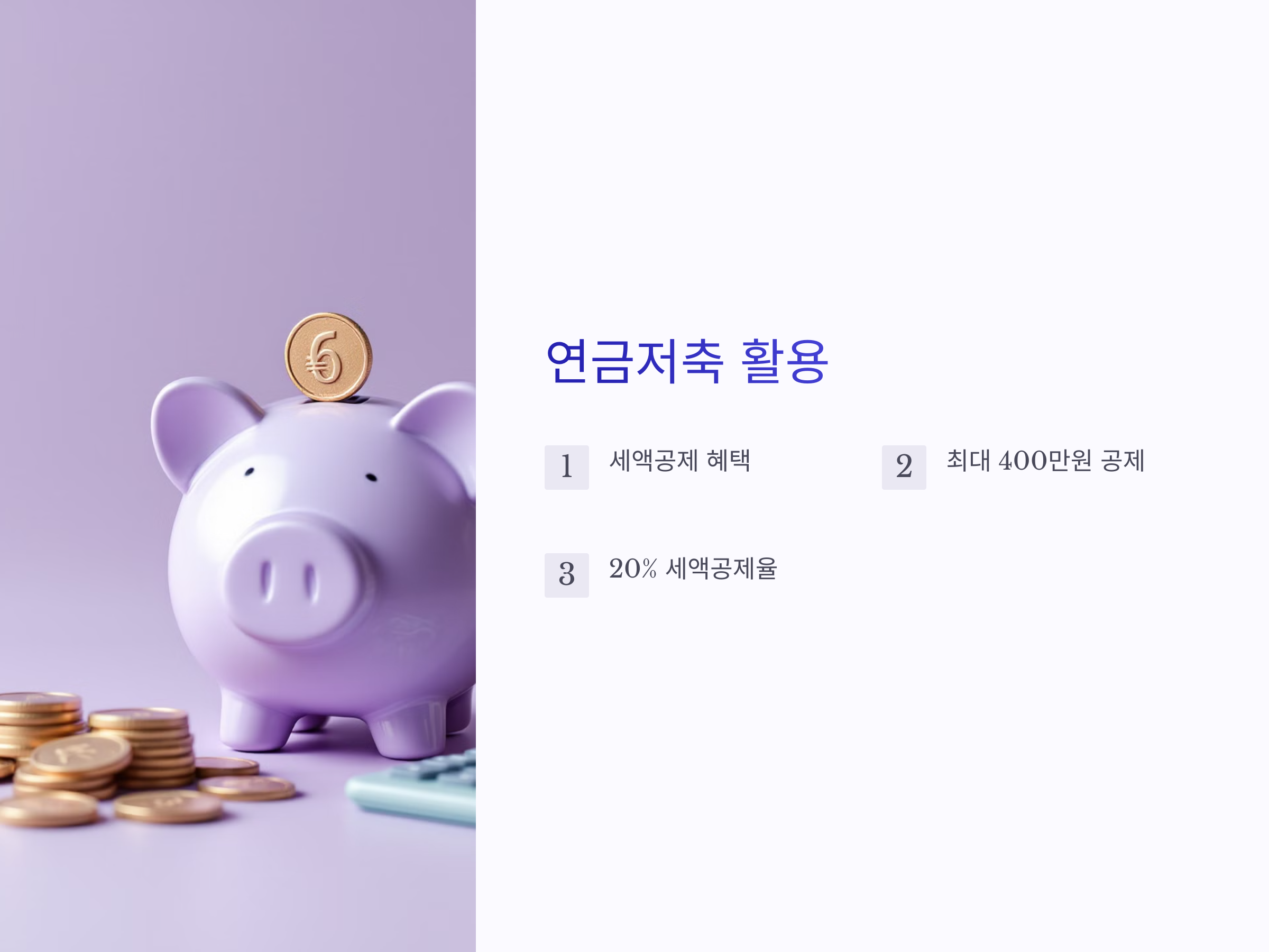 연금저축은 노후를 준비하는 가장 기본적인 방법입니다. 특히, 연금저축에 투자한 금액에 대해 세액공제를 받을 수 있어 세금 혜택이 큽니다. 만약 50대 이상이라면, 연금저축에 최대 400만 원까지 세액공제를 받을 수 있습니다. 20%의 세액공제를 받으므로, 실제로 투자하는 금액보다 더 큰 세금 혜택을 받을 수 있습니다. 연금저축은 일정 기간 동안 돈을 묶어 놓아야 하기 때문에 계획적으로 활용하면 노후를 위한 안정적인 준비가 될 수 있습니다.