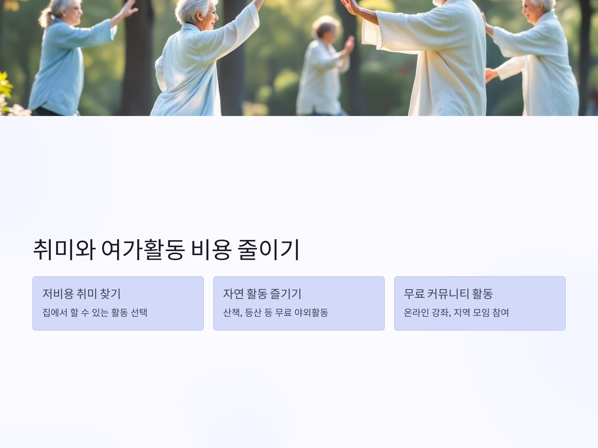 취미나 여가활동은 중요한 노후 생활의 일부입니다. 그러나 너무 많은 비용을 들여 취미 활동을 하면 결국 생활비에 부담을 줄 수 있습니다. 비용을 줄이면서도 즐길 수 있는 활동을 찾아보세요. 예를 들어, 집에서 할 수 있는 취미를 찾거나, 자연에서 즐길 수 있는 산책이나 등산을 통해 비용을 절감할 수 있습니다. 또한, 온라인에서 제공되는 무료 강좌나 커뮤니티 활동을 통해 즐거운 여가 시간을 보낼 수 있습니다.