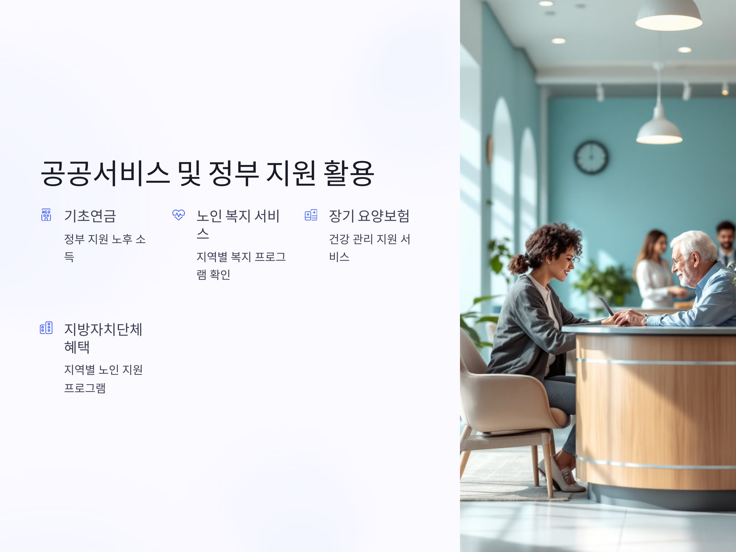 노후에 도움이 되는 다양한 정부 지원 프로그램이나 공공서비스가 있습니다. 예를 들어, 기초연금, 노인 복지 서비스, 또는 장기 요양보험 등을 적극적으로 활용할 수 있습니다. 이를 통해 생활비를 절감하고, 필요한 서비스를 적절히 이용할 수 있습니다. 또한, 각 지방자치단체에서 제공하는 노인 지원 혜택을 놓치지 않도록 꼼꼼히 확인해 보세요.