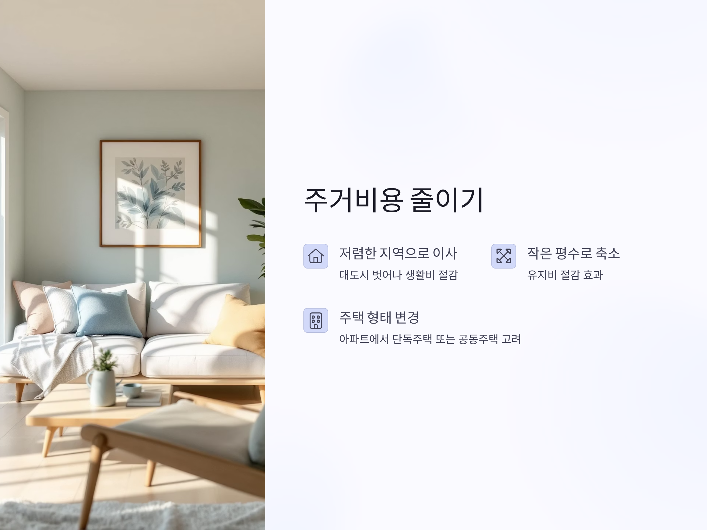 노후 생활에서 가장 큰 지출 중 하나는 주거비용입니다. 많은 사람들은 은퇴 후에도 기존의 집에서 계속 살기를 원하지만, 주거비용을 줄이는 것은 중요한 절약 방법 중 하나입니다. 예를 들어, 대도시에서 벗어나 상대적으로 생활비가 저렴한 지역으로 이사하는 방법도 고려할 수 있습니다. 또는, 집을 작은 평수로 줄여 유지비를 절감할 수 있습니다. 또한, 아파트에서 단독 주택으로의 전환이나 공동 주택 등의 옵션도 고민해보세요.