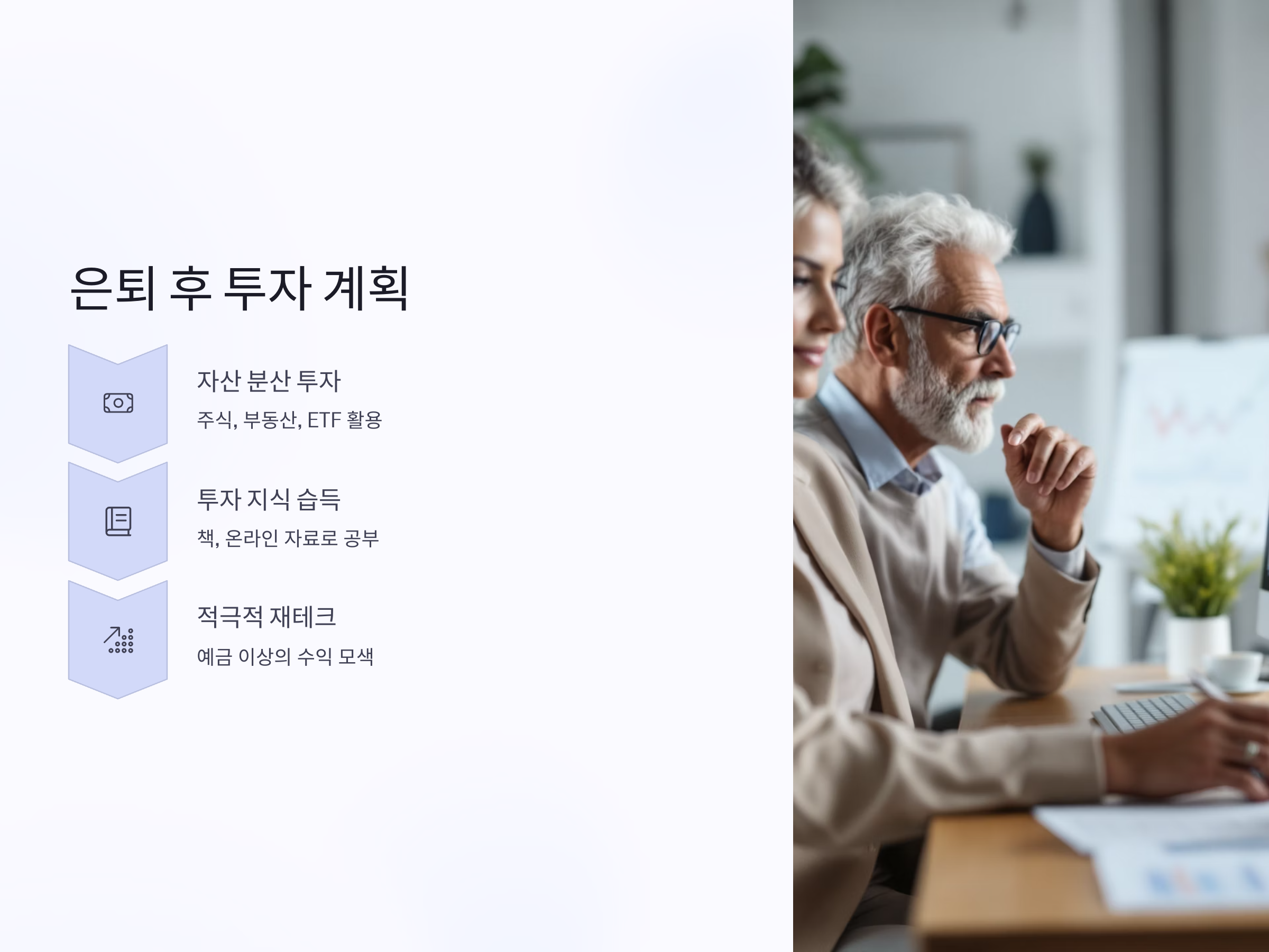 은퇴 후에도 지속적으로 수입을 올릴 수 있는 방법을 생각해야 합니다. 이를 위해 은퇴 전, 적절한 투자 계획을 세워두는 것이 중요합니다. 주식, 부동산, 혹은 상장지수펀드(ETF) 등 다양한 방법으로 자산을 분산 투자할 수 있습니다. 또한, 적극적인 재테크 활동을 통해 예금 이상의 수익을 올릴 수 있는 방법들을 모색해보세요. 투자에 대한 기본적인 이해를 돕는 책이나 온라인 자료를 활용하여 공부할 수 있습니다.