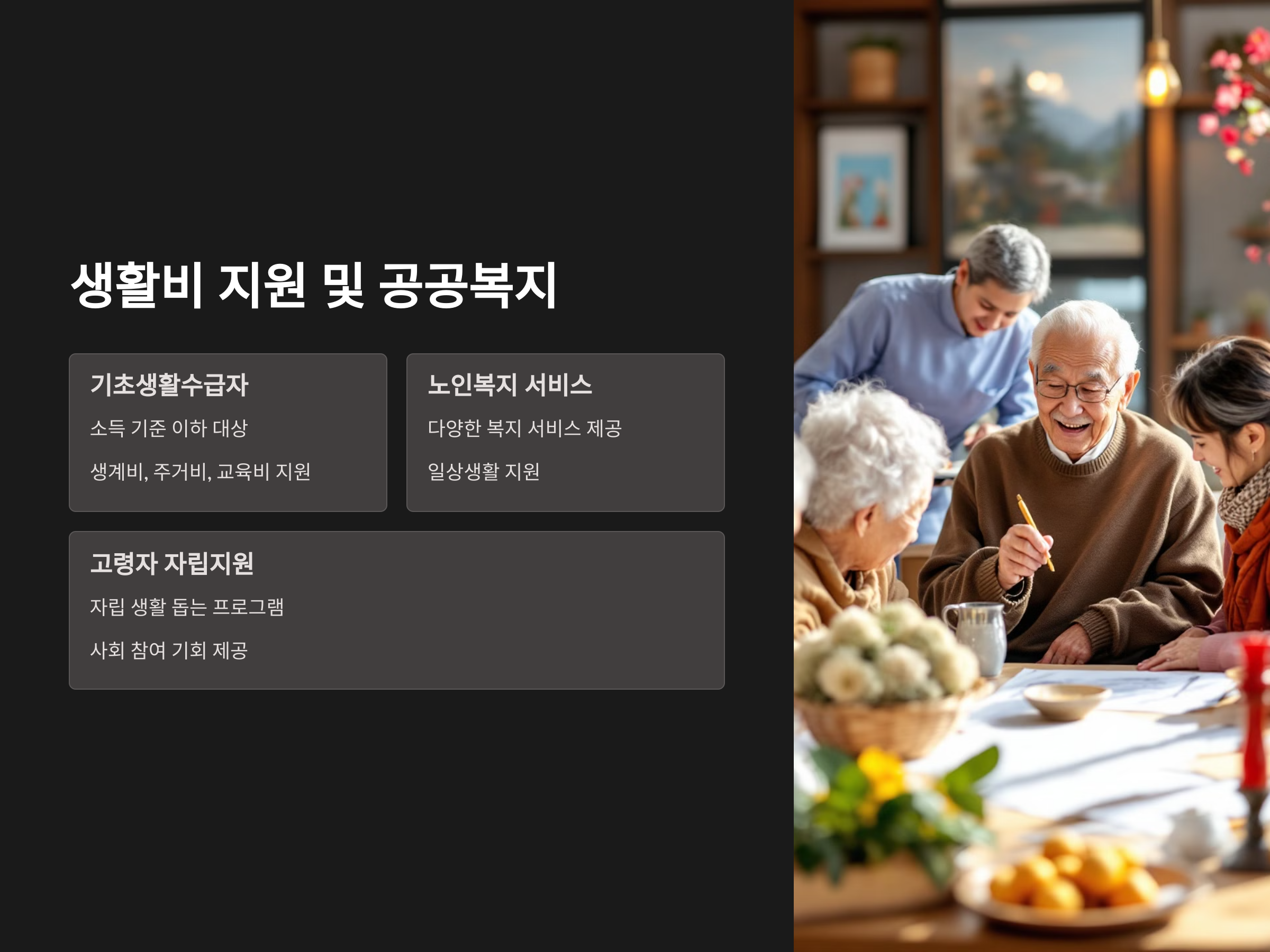 기초생활수급자는 소득이 일정 기준 이하인 사람들에게 생활비를 지급하는 제도입니다. 이 외에도, 고령자 자립지원이나 사회복지시설 이용 지원 등 다양한 공공복지 서비스가 제공되고 있습니다.