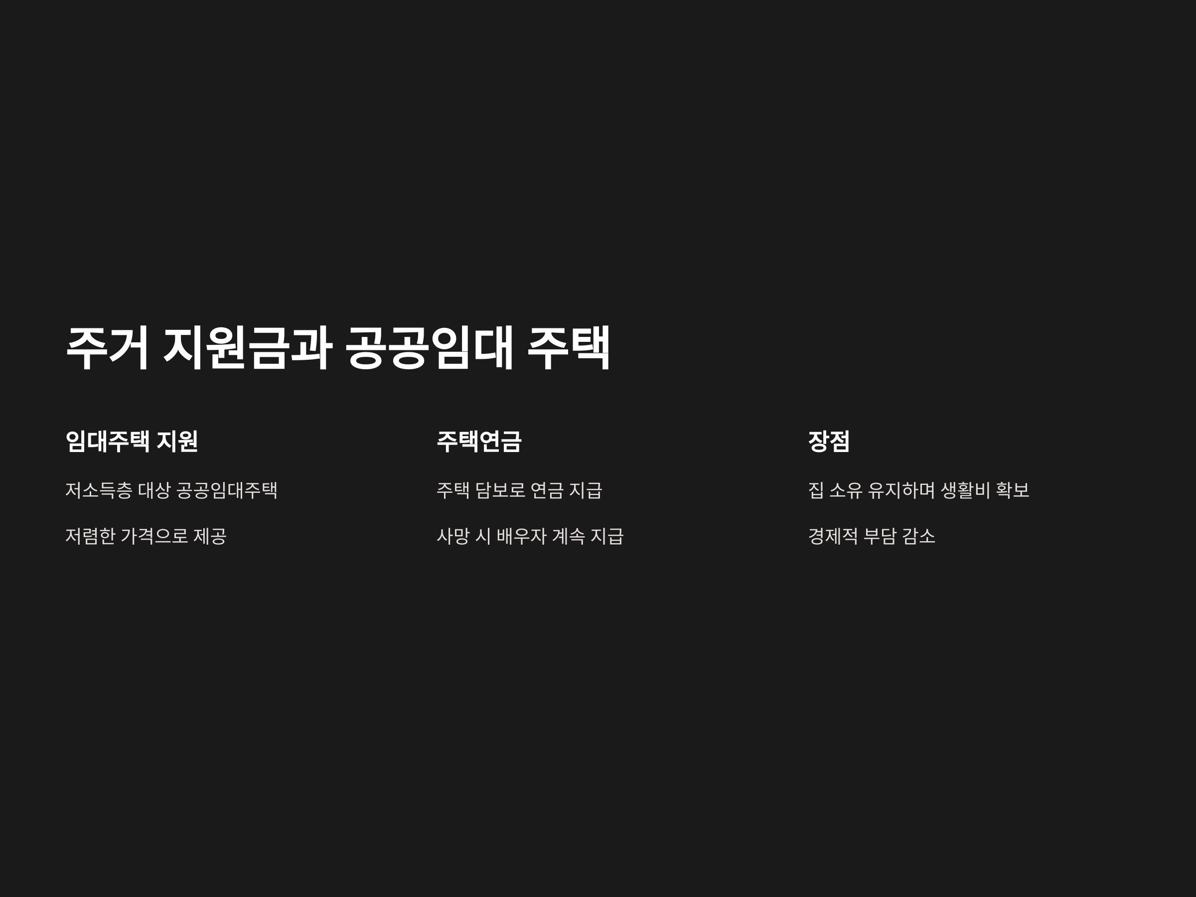임대주택 지원은 저소득층을 대상으로 공공임대주택을 저렴한 가격에 제공하는 제도입니다. 또한, 주택연금은 주택을 소유한 노인이 일정 연령에 도달하면 그 집을 담보로 연금을 받을 수 있는 제도입니다. 이는 주택을 팔지 않고도 지속적으로 일정 금액을 매월 받을 수 있기 때문에 노후의 경제적 부담을 크게 줄여줄 수 있습니다.