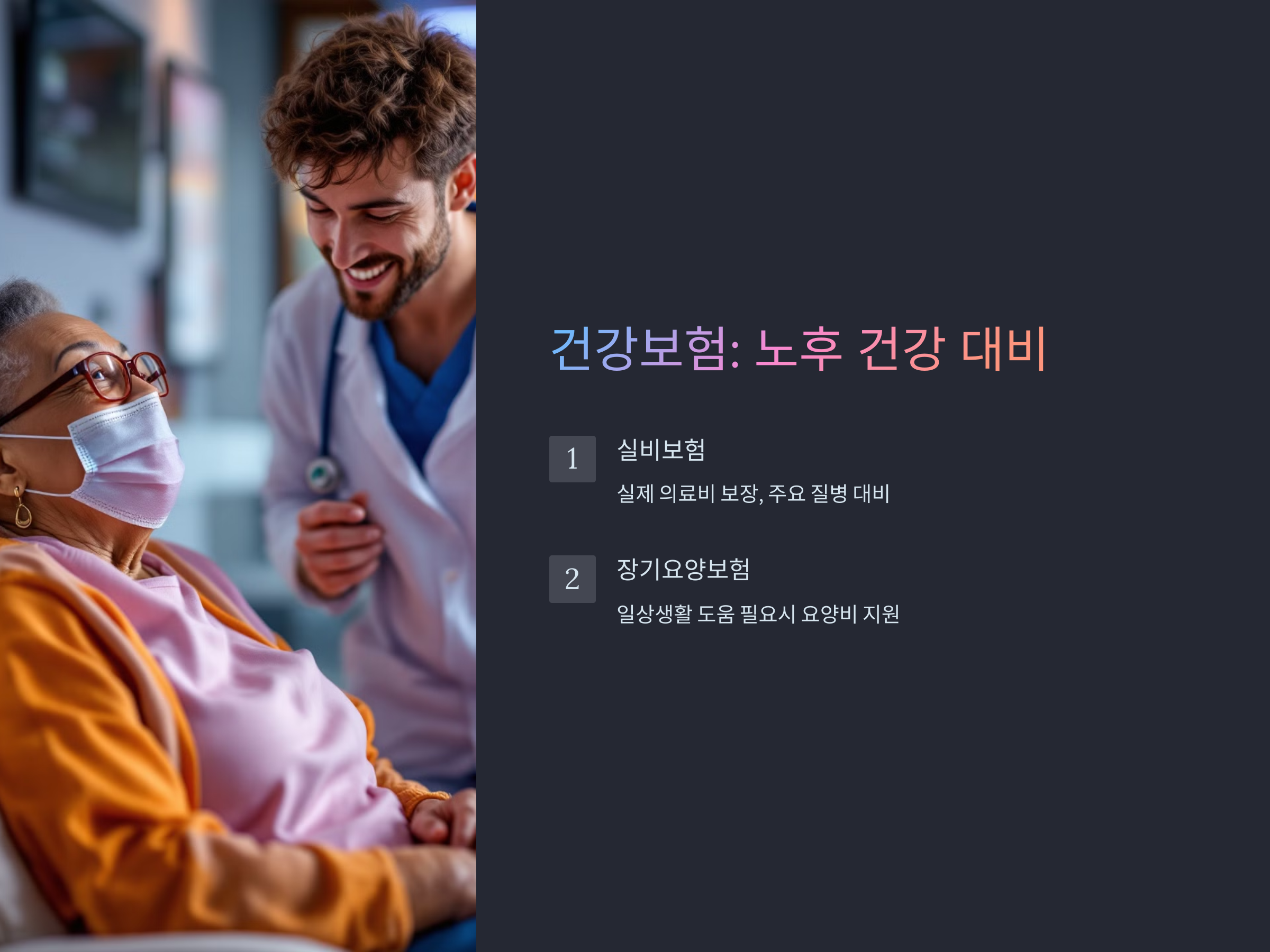 건강보험은 단순히 병원비를 보장하는 것 이상으로, 노후 생활에서 중요한 역할을 합니다. 특히 나이가 들면서 질병 발생 확률이 높아지고, 의료비 부담도 커지기 때문에 실비보험을 포함한 종합적인 건강보험이 중요합니다.